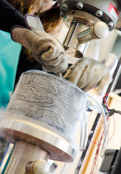 entnahmen die gefrorene Probe dem Druckzylinder und lösten die beiden Eisformen