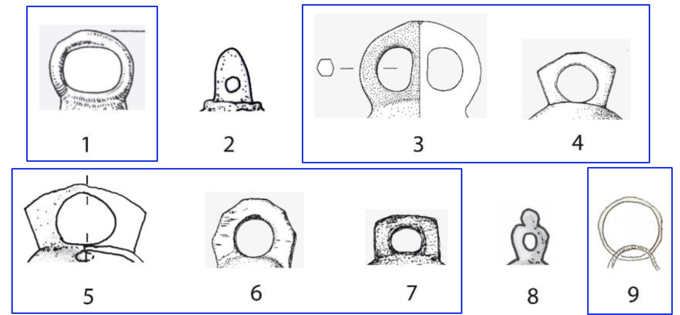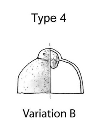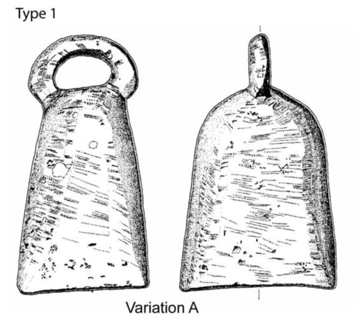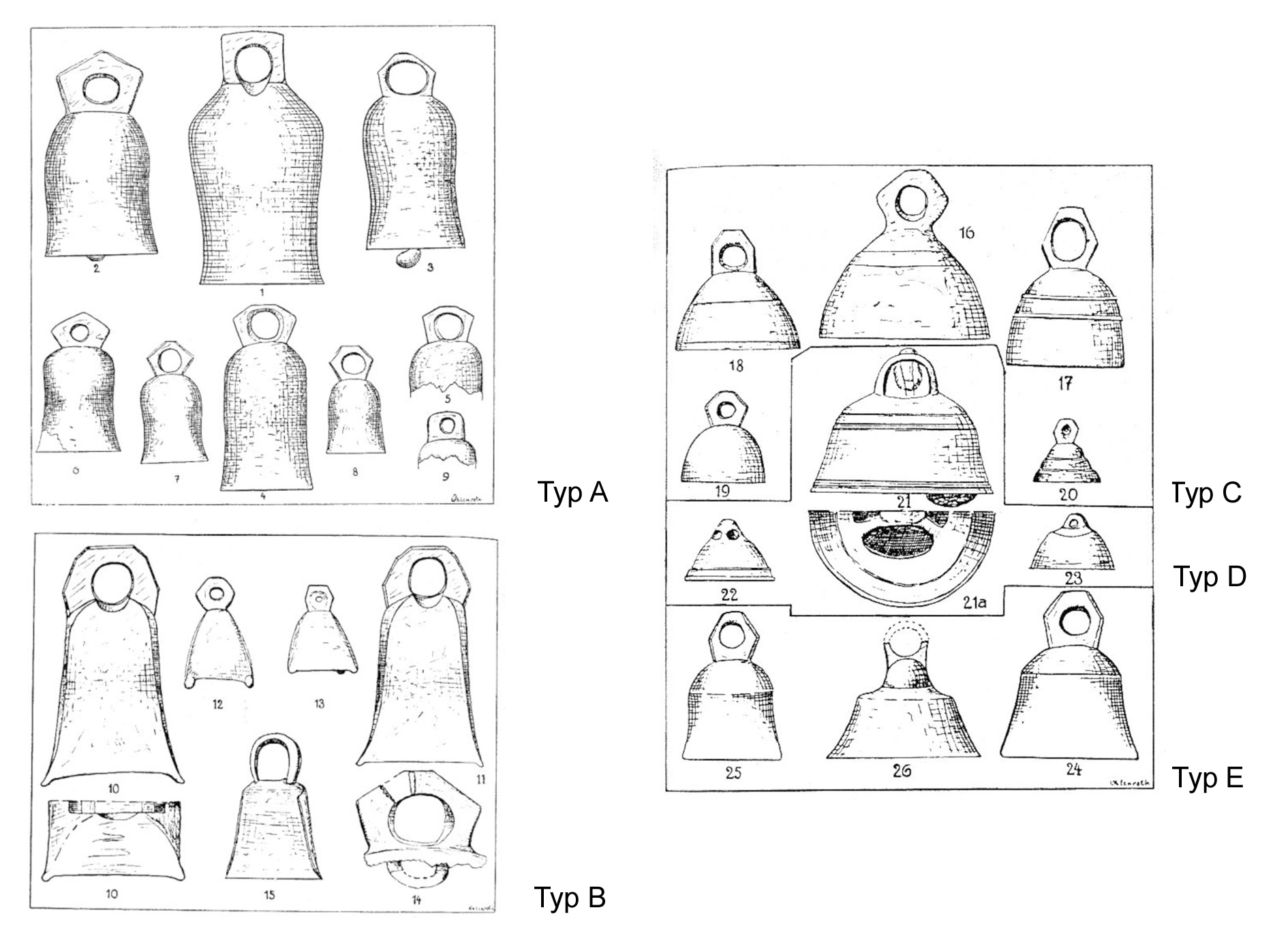 Variante 3 (nur aus dem Balkanraum bekannt): zylindrisch, klein (5,0-7,0 cm hoch), schlanke tintinnabula mit an der Basis stark ausgeweitetem Mantel mit flachen, gr. Henkeln (Breite des Henkels an der Basis entspricht dem Dm des Mantels)