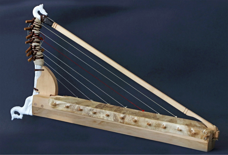 Problematisch gestaltete sich die Wahl des Saitenmaterials. Nach eingehenden Diskussionen fiel die vorläufige Entscheidung zugunsten von Harfensaiten aus Darm, wie sie auch für kleine Rahmenharfen benutzt werden. Weitere Materialien wie Pflanzenfasern oder insbesonders Pferdehaare stehen zur Diskussion und sollen bei kommenden Nachbauten getestet werden. Pferdehaare als Instrumentensaiten haben neben der Besaitung von Bögen für Streichinstrumente eine lange Tradition. Als Beispiel sei die mongolische Pferdekopfgeige (morin chuur) , eine zweisaitige Kastenspießlaute genannt, die zudem ebenfalls mit Pferdeköpfen verziert ist. Eine einzelne Saite besteht aus 100 bis 130 einzelnen Haaren eines Pferdeschweifes, die untereinander keinen Zusammenhalt haben, weder miteinander versponnen noch umwickelt sind.