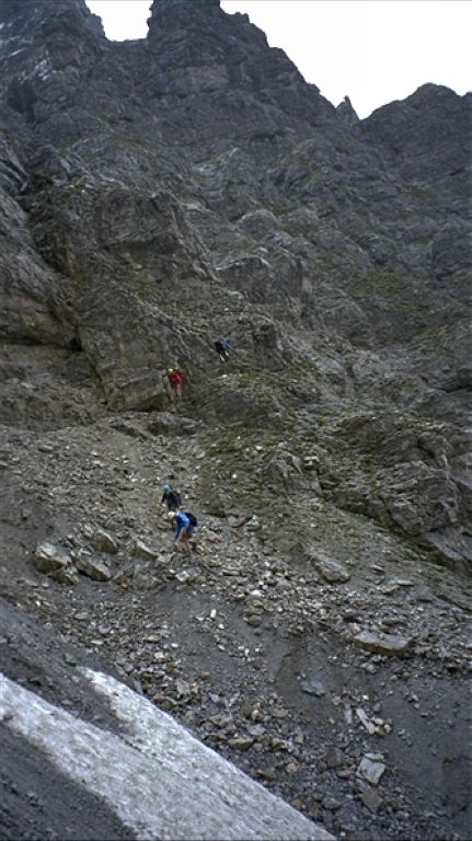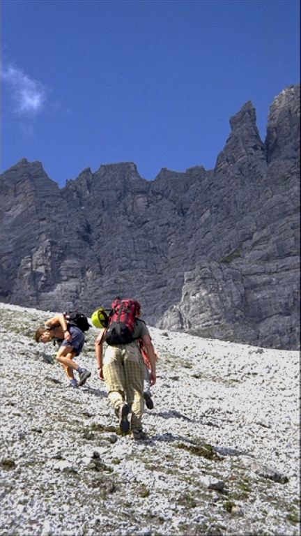 Unter der Serles-Nordwand vorbei, geht es auf Schotterreißn hinauf zum Ende der Rinne die uns zum Turm führen soll.
