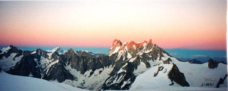Langsam beginnen die Sterne zu verblassen und der Himmel hinter Grandes Jorasses und Dent du Géant verfärbt sich zu einem blutigen Rot. Die Brenvaflanke wirkt nun schon etwas weniger gefährlich und mit dem sich gelblich verfärbenden Horizont stellt sich bei uns ein Zustand ein den man mit dem Oxymoron "müheloses Steigen" bezeichnen könnte. Doch schon bald treten neue Schwierigkeiten in Form von verschneiten Vierer Stellen in unseren Weg. Wir sind froh als wir zu Mittag die Mont Maudit West Schulter (4336m) erreichen. Eine uns entgegenkommende Seilschaft rät uns davon ab dem Grat zum Gipfel weiter zu folgen und wir entschließen uns auf das Col Maudit (4035m) abzusteigen.