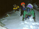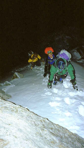 Im Kegel unserer Stirnlampen erkennen wir lose Blöcke und verschneite Risse auf der