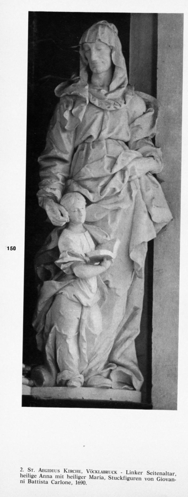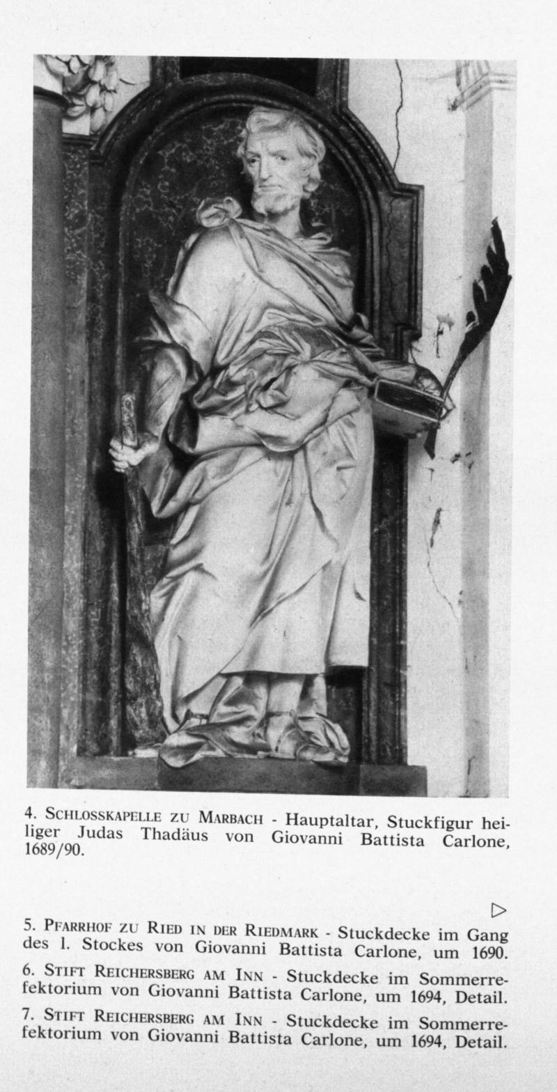 für die Stuckarbeiten bei den drei Altären und an deren Zierrat, die er im Namen von Giovanni Battista Carlone bestätigte, erwähnt (Österreichische Kunsttopographie, Wien, 1959. Bis jetzt liegt noch keine Differenzierung der Werke vor und die