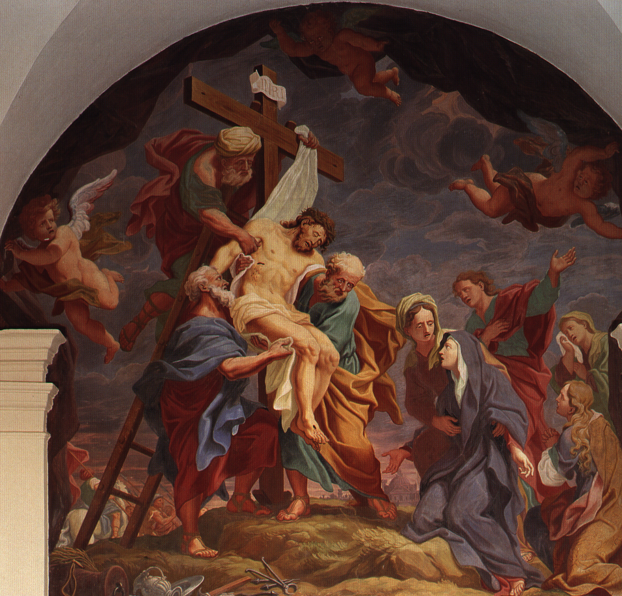 Das Fresko von Quaglio in Pustal bedeckt die gesamte Hinterwand der Kapelle, es stellt die Kreuzabnahme Jesu dar. Unterschrift und Datum sind am unteren Bildrand links lesbar: „IULIUS QUALEUS / P. Anno 1706“.