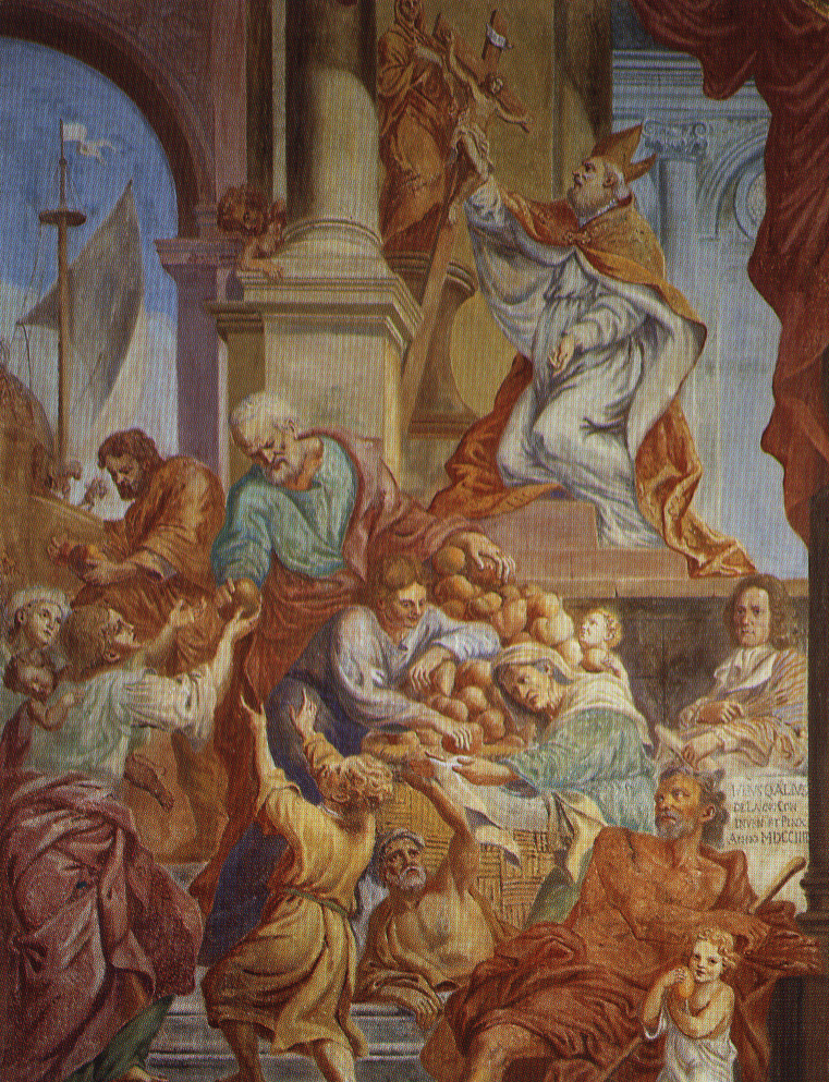 1705/1706: Deckenfresken im Mittelschiff. Das große Fresko im Mittelschiff zeigt im Mittelteil in einem gemalten Rahmen die Glorie des Hl. Nikolaus und an den Rändern die Christenverfolgung unter Nero und Diokletian. Zwischen den Fenstern stellt Quaglio die zwölf Apostel sitzend dar und in den Stichkappen neben symbolischen Figuren Engel.