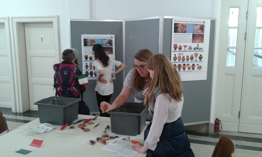 An zwei Workshopstationen wurde Abgusstechnik, also die Methode, täuschend echte Repliken antiker Figuren herzustellen, vorgeführt und die Arbeit von Archäologen gezeigt. Selbständig konnten Repliken antiker Keramik ausgegraben und anhand von Vergleichsbeispielen kulturgeschichtlich eingeordnet und datiert werden.