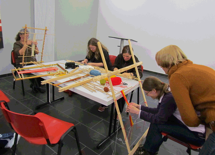 Zuvor fand unter Leitung von Frau Nutz für die Teilnehmer des Forums ein Sprang-Workshop statt, der auch rege in Anspruch genommen wurde. Im Zuge dieses Workshops konnte jede/jeder Teilnehmer/in seinen oder ihren eigenen Sprangrahmen basteln und anschließend ein erstes Werkstück versuchen. Dabei wurden die Grundkenntnisse der Sprang-Arbeit vermittelt. Vom Schären der Kette über die drei unterschiedlichen Arten die Kettfäden miteinander zu verflechten (Einhängesprang, Flechtsprang und Zwirnbindesprang) bis zur Fixierung der Mitte beim Abschluss der Arbeit.