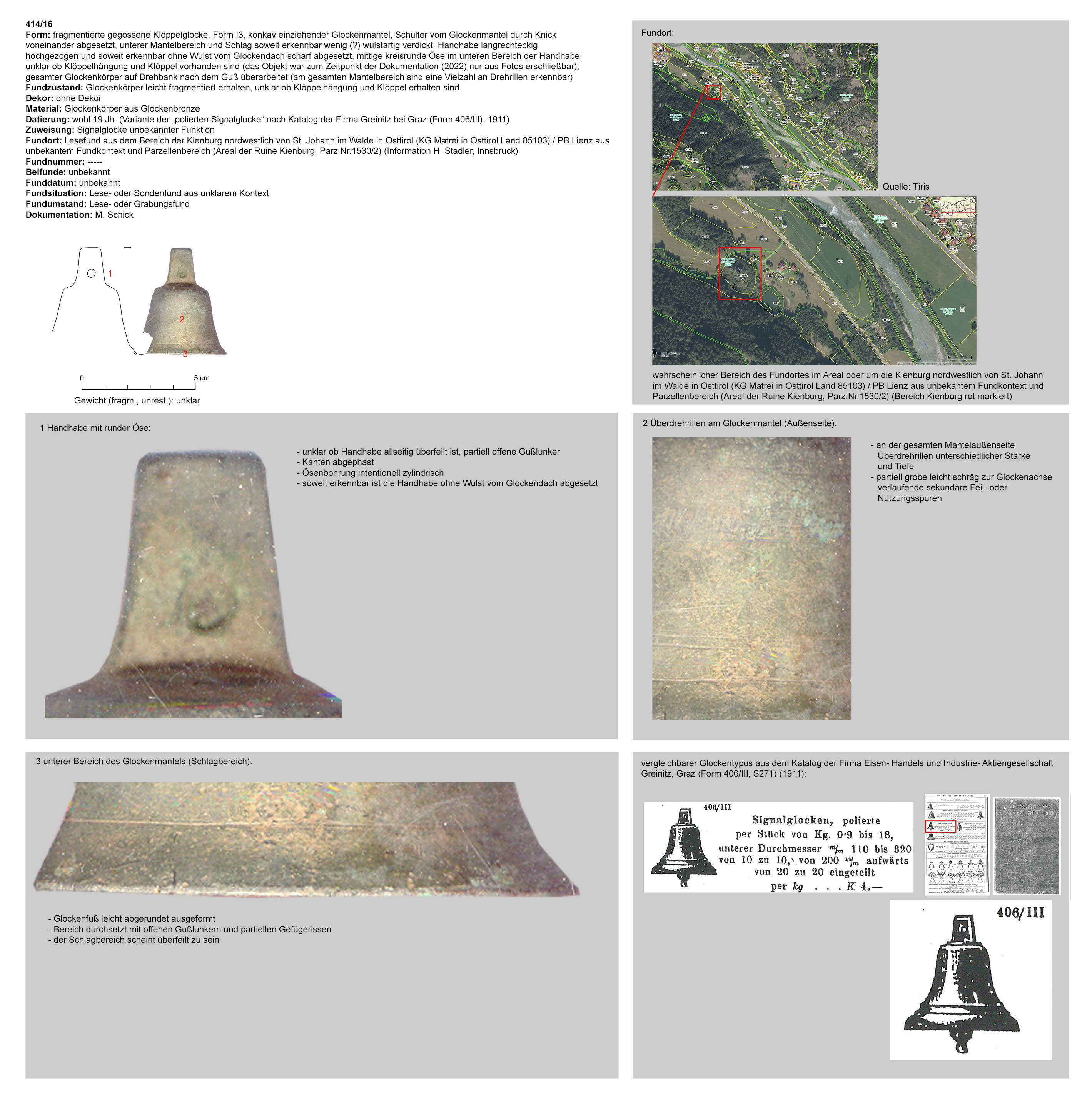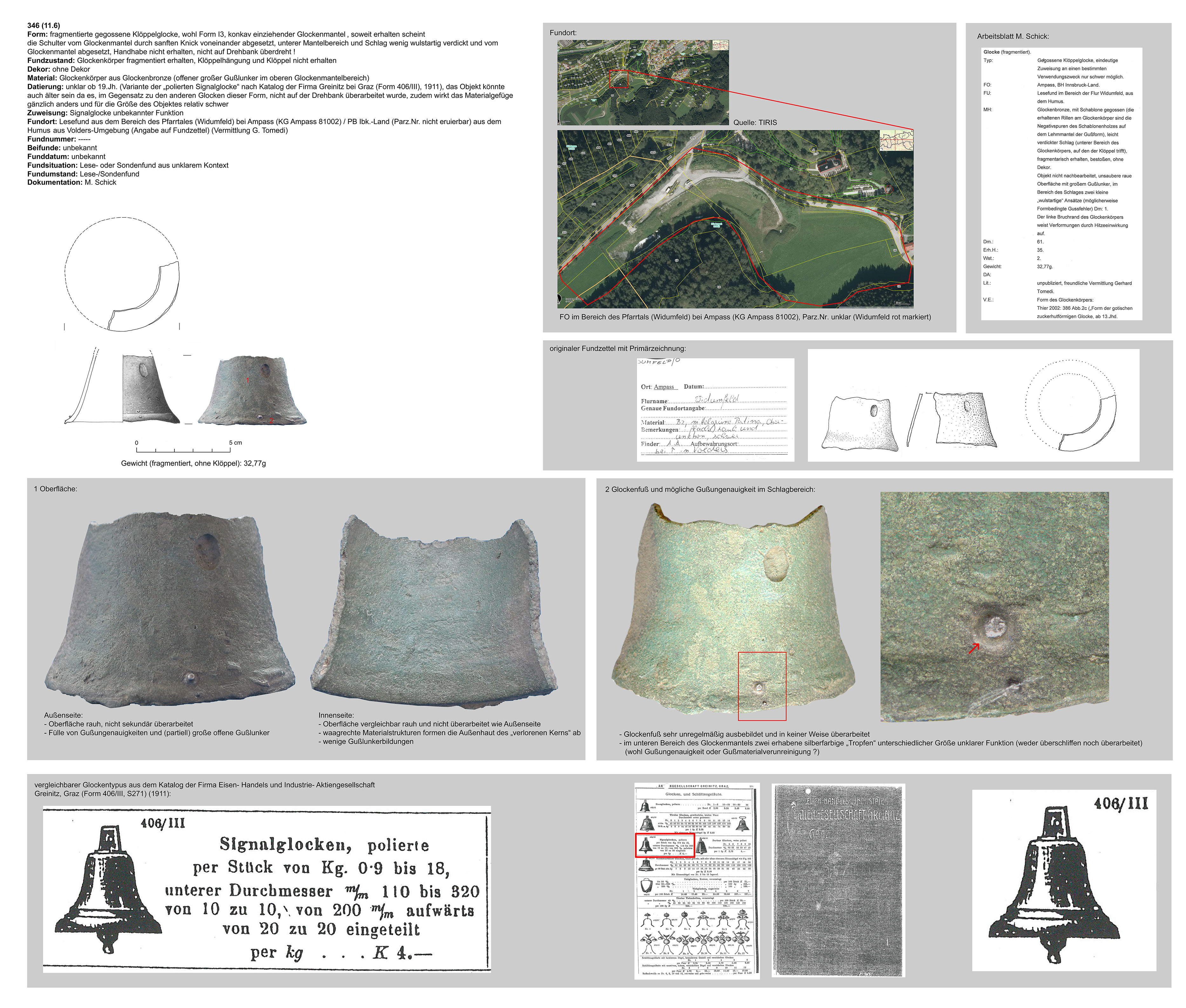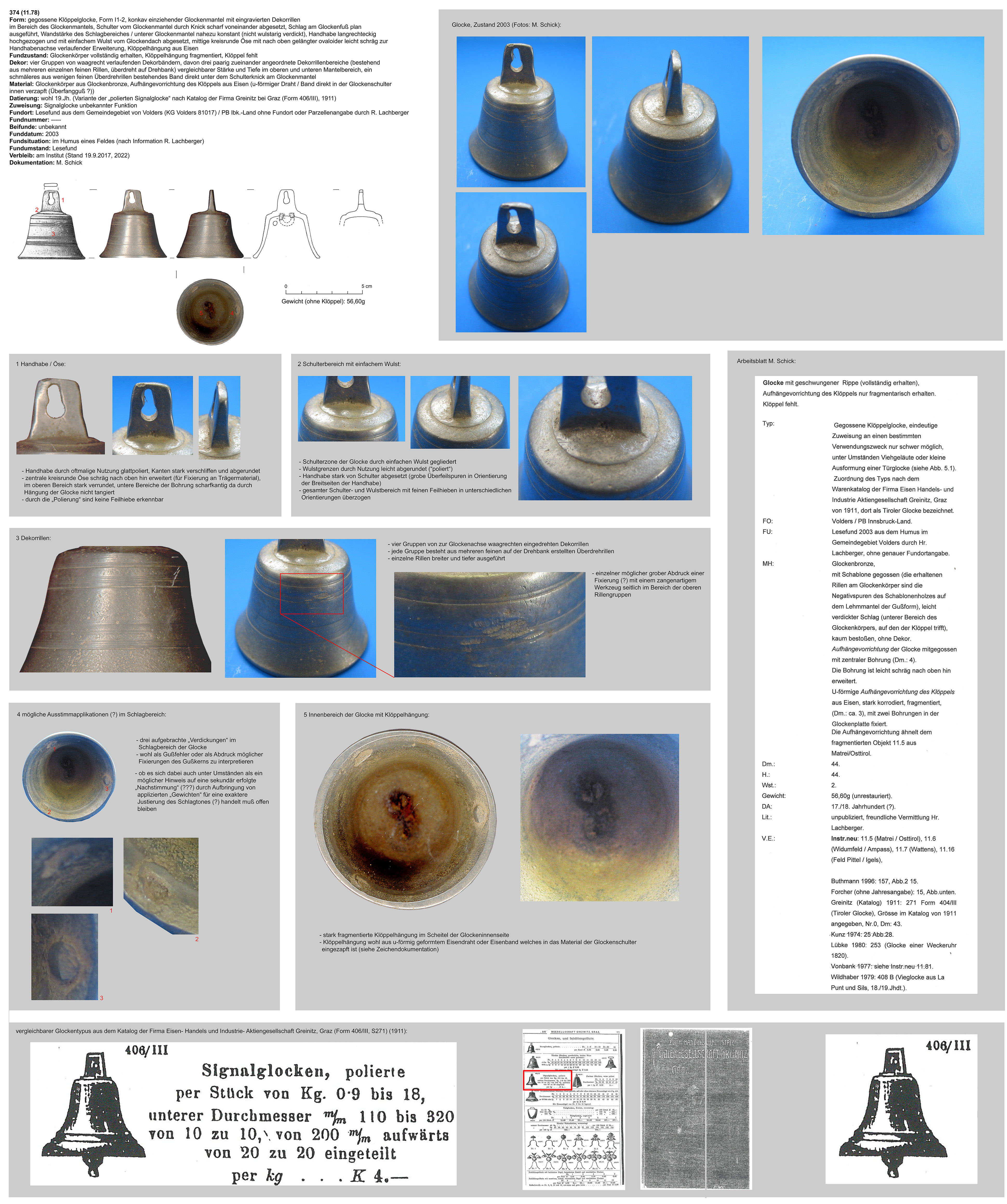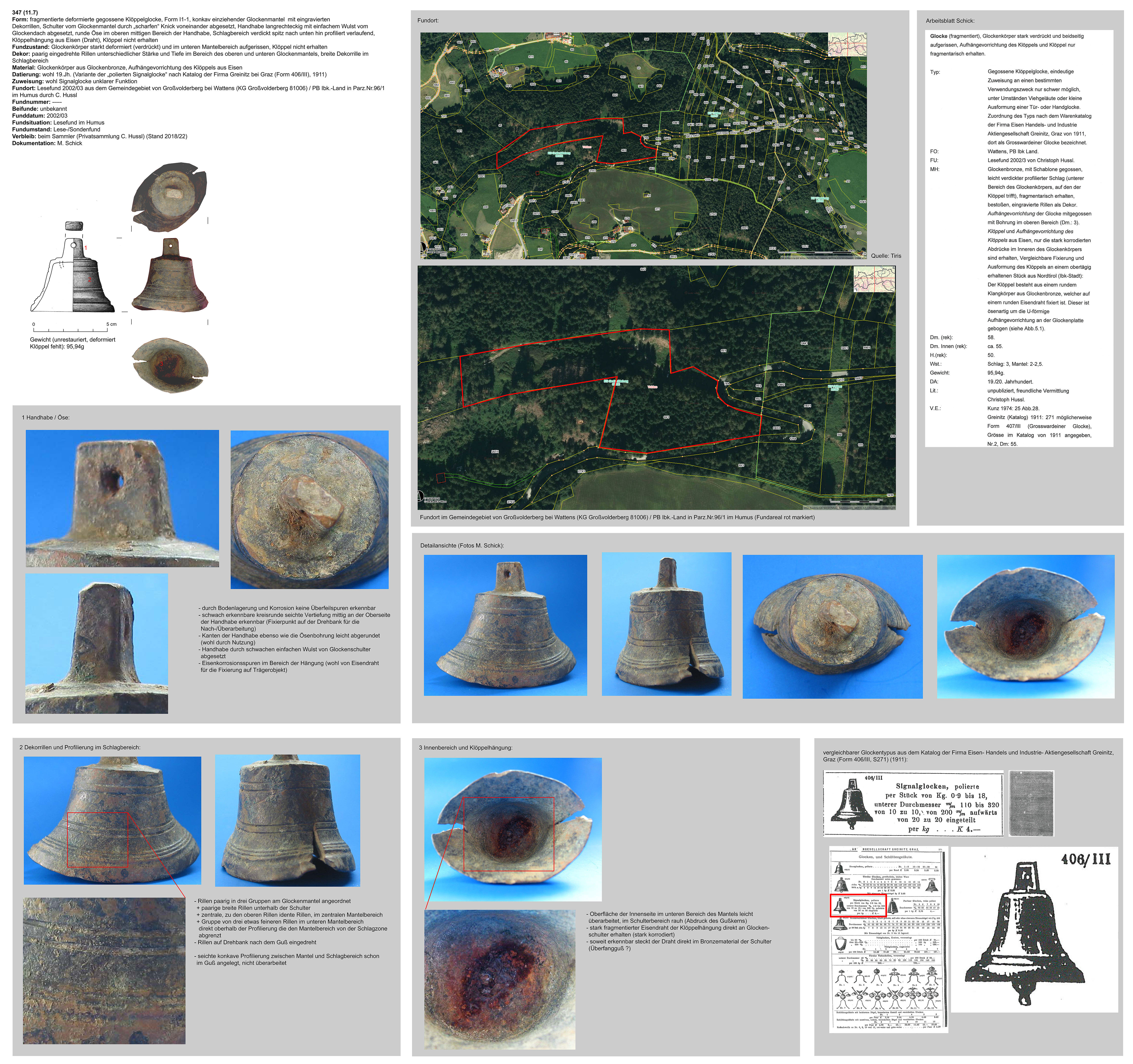 | 347 (11.7) | Großvolderberg, Parz.96/1), Wattens (Hussl) | Tallage (Lesefund) | 2 eingedrehte paarige Dekorrillen am Glockenmantel, im Schlagbereich leicht erhabene Dekorrillen | ||