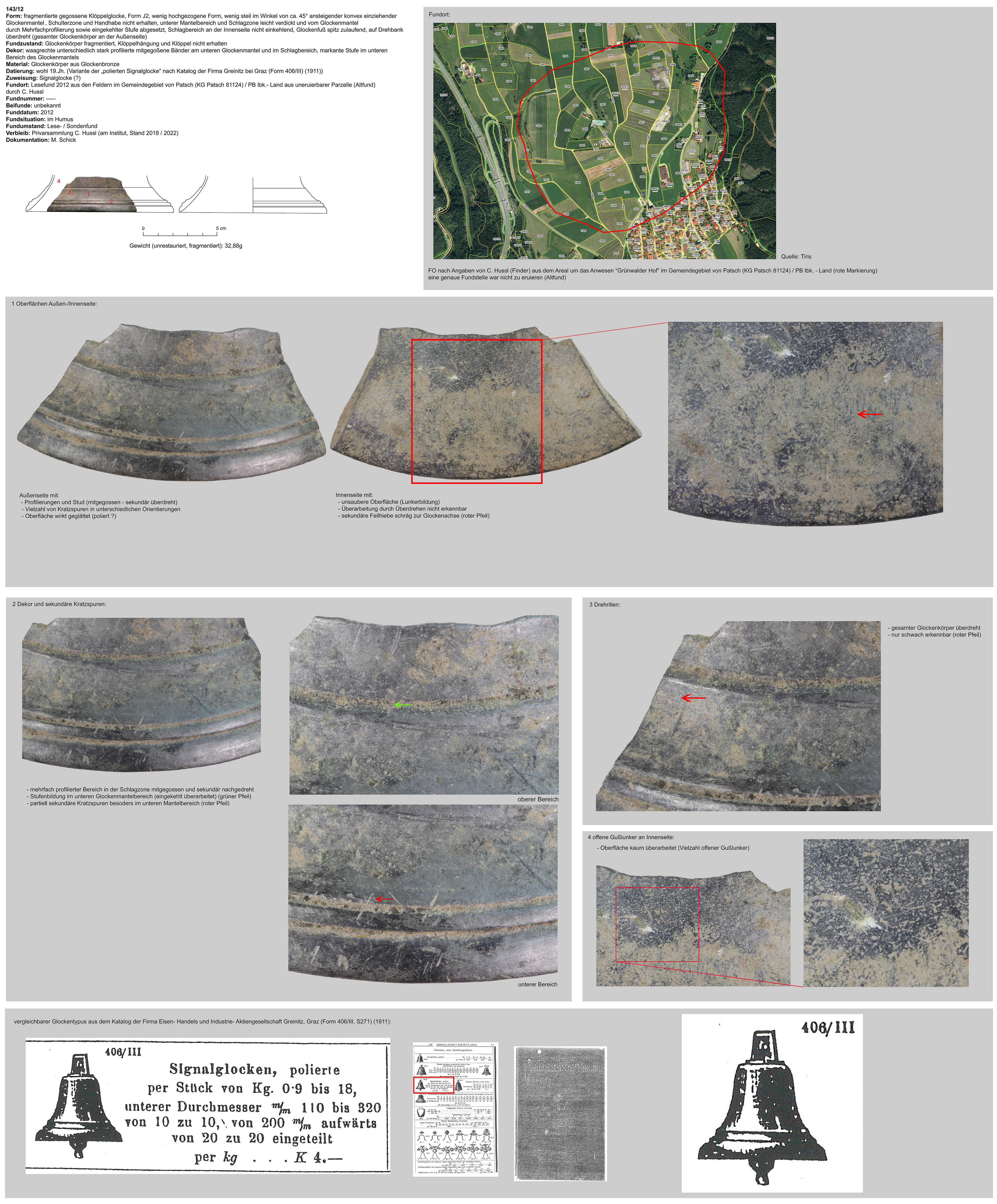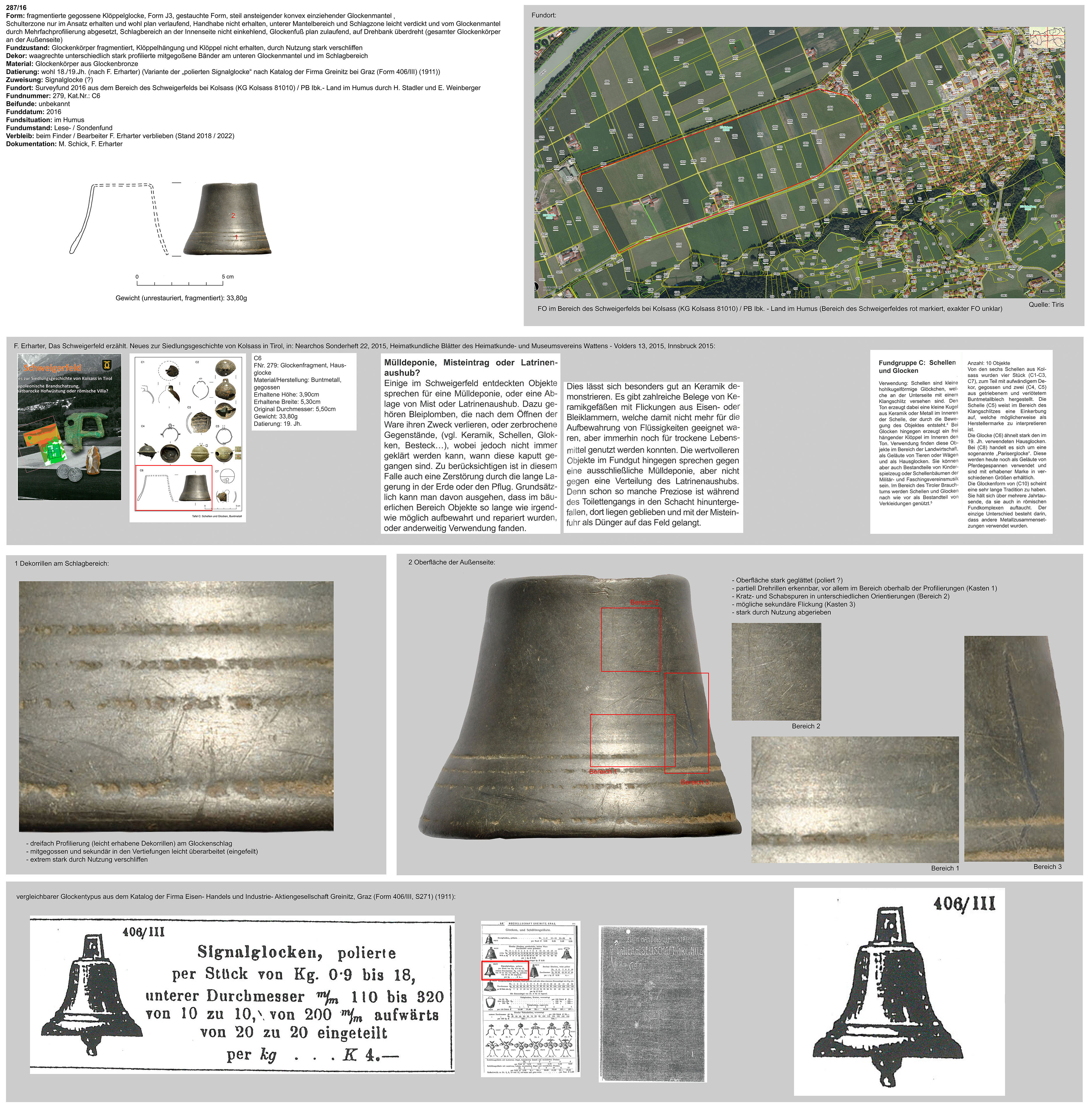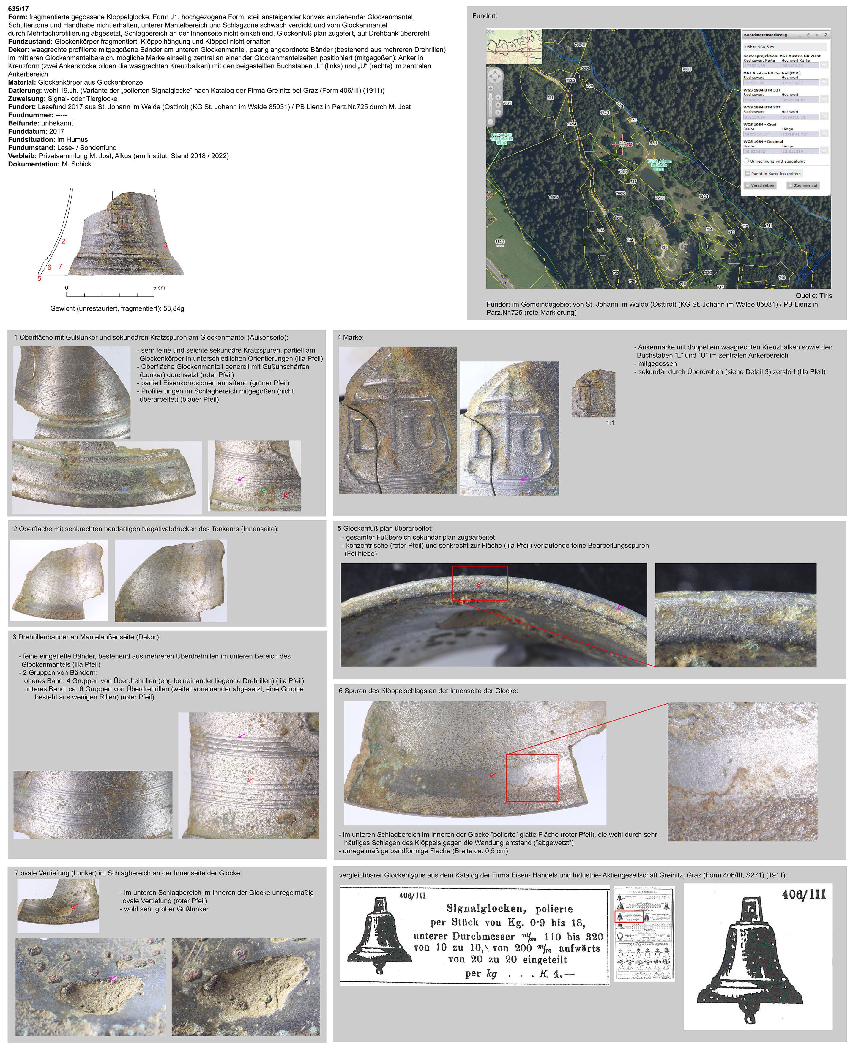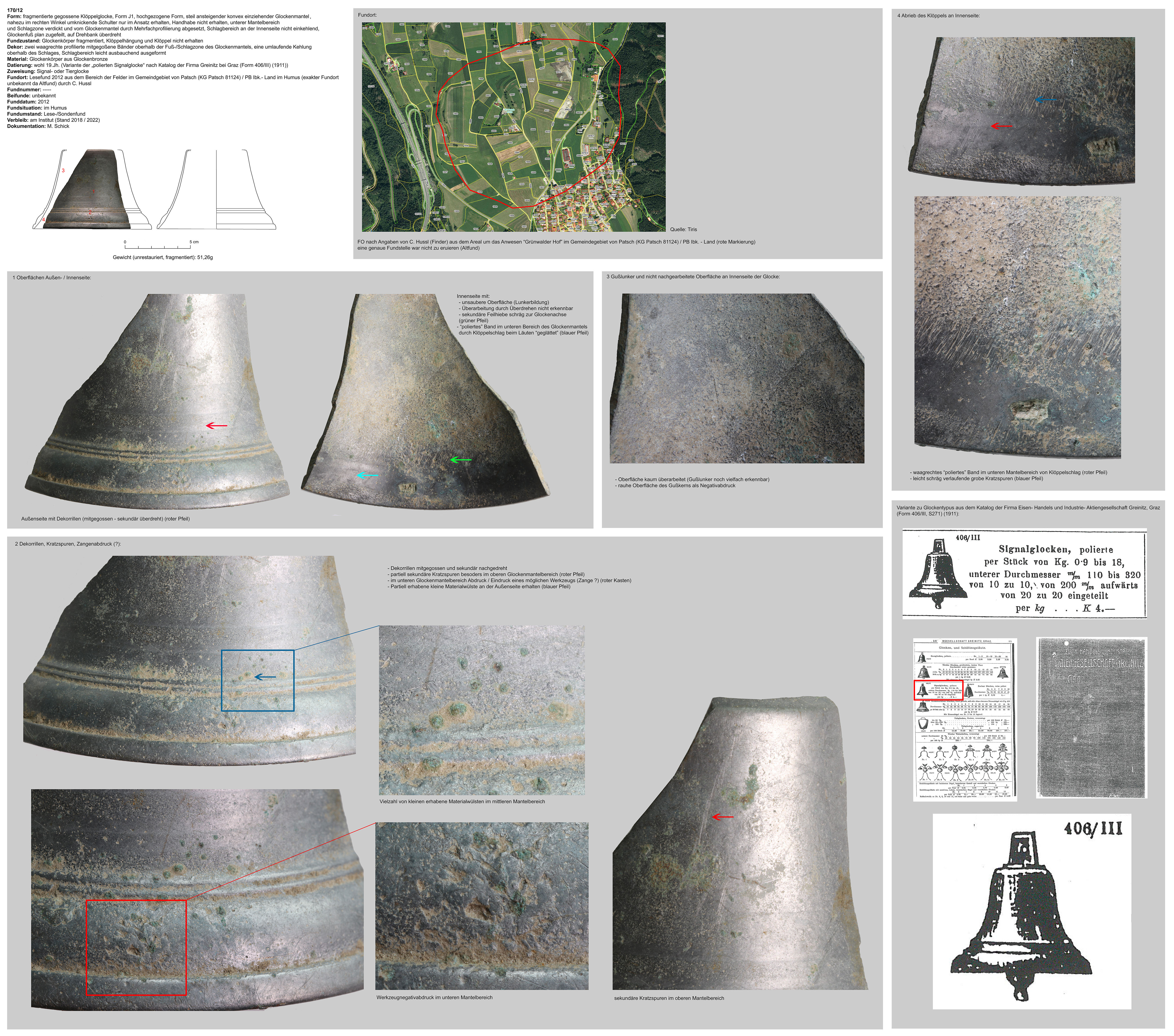 | KG St. Johann im Walde/Osttirol (85031), Parz.Nr.725, Humusfund (Jost) | Tallage (Lesefund) | erhaben mitgegossene Dekorrillen an Mantel und Schlag, erhabene „Marke“ im zentralen Mantelbereich (L und U von zentralem Kreuz/Armbrust getrennt), wohl Herstellermarke | |||