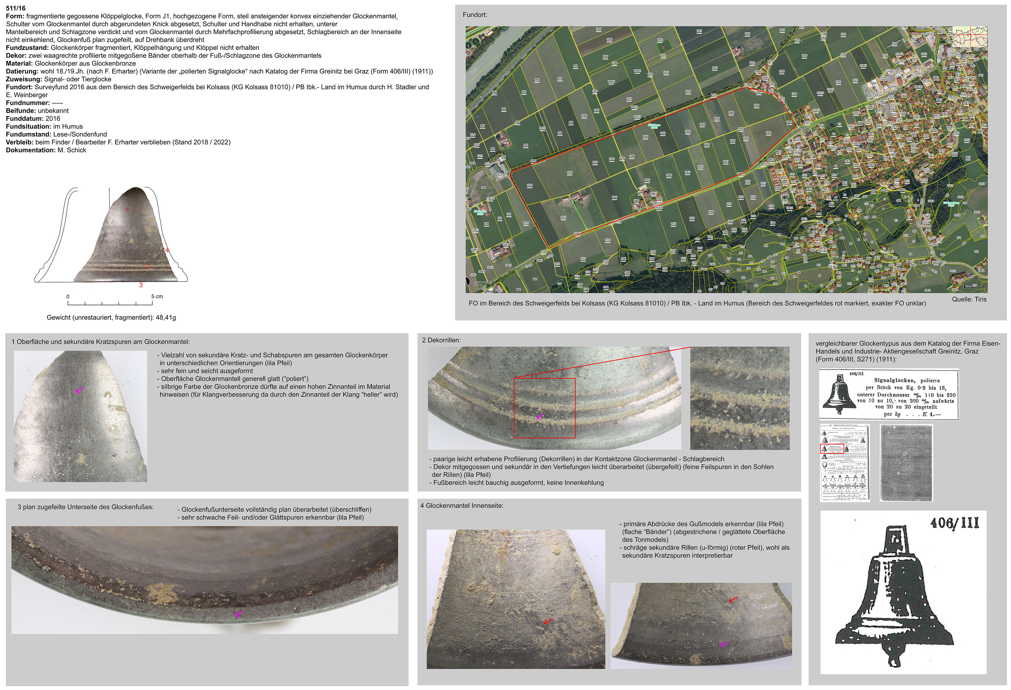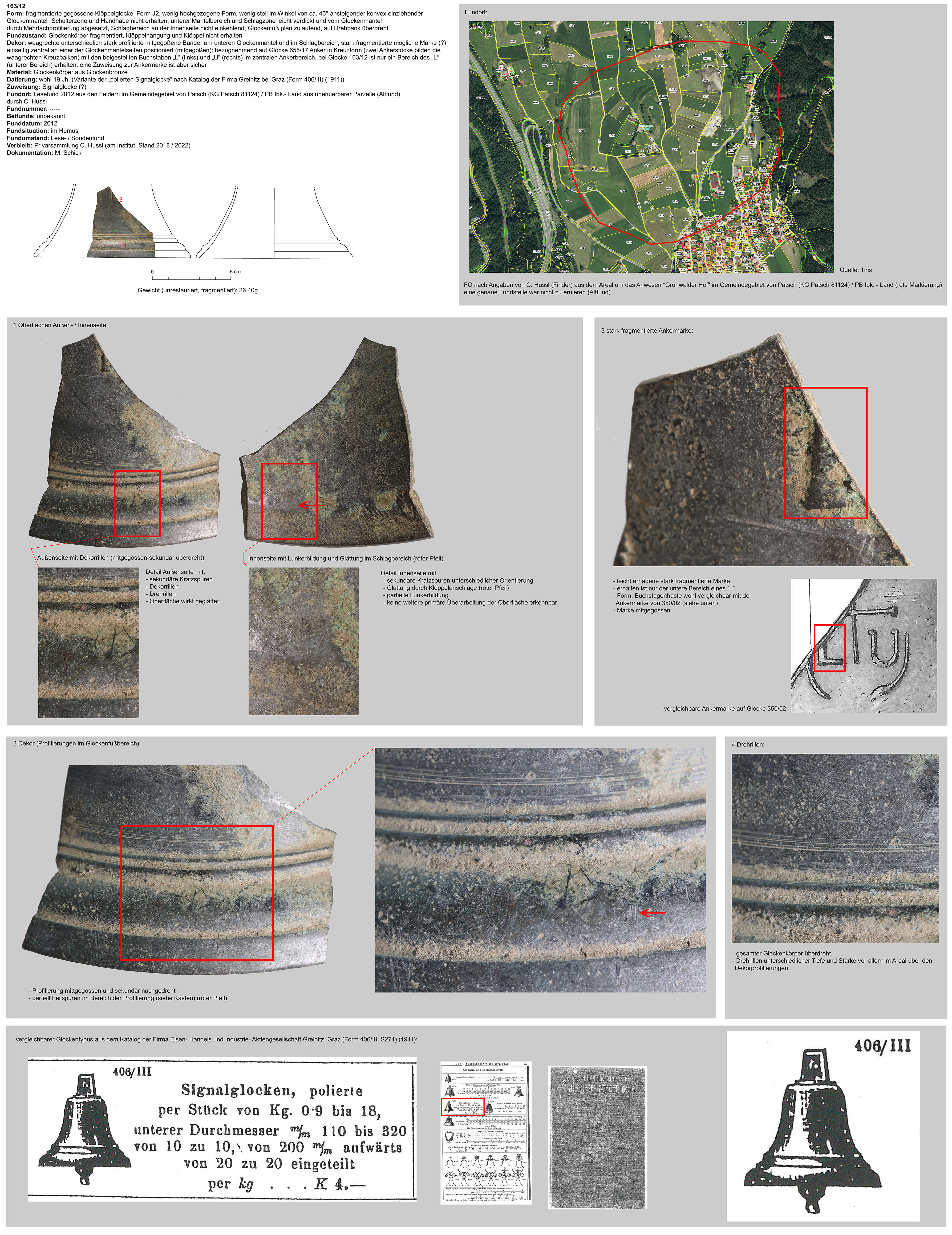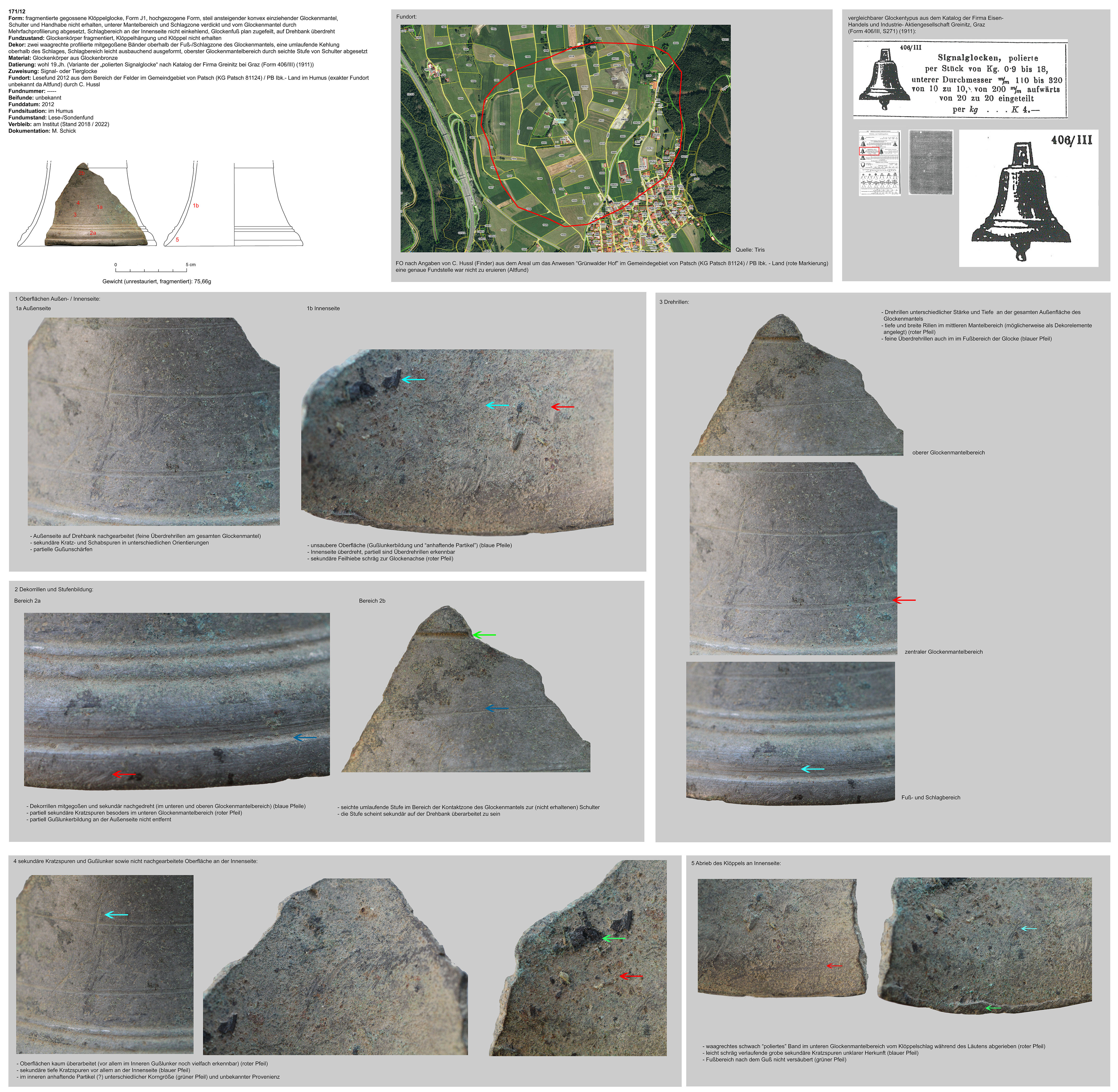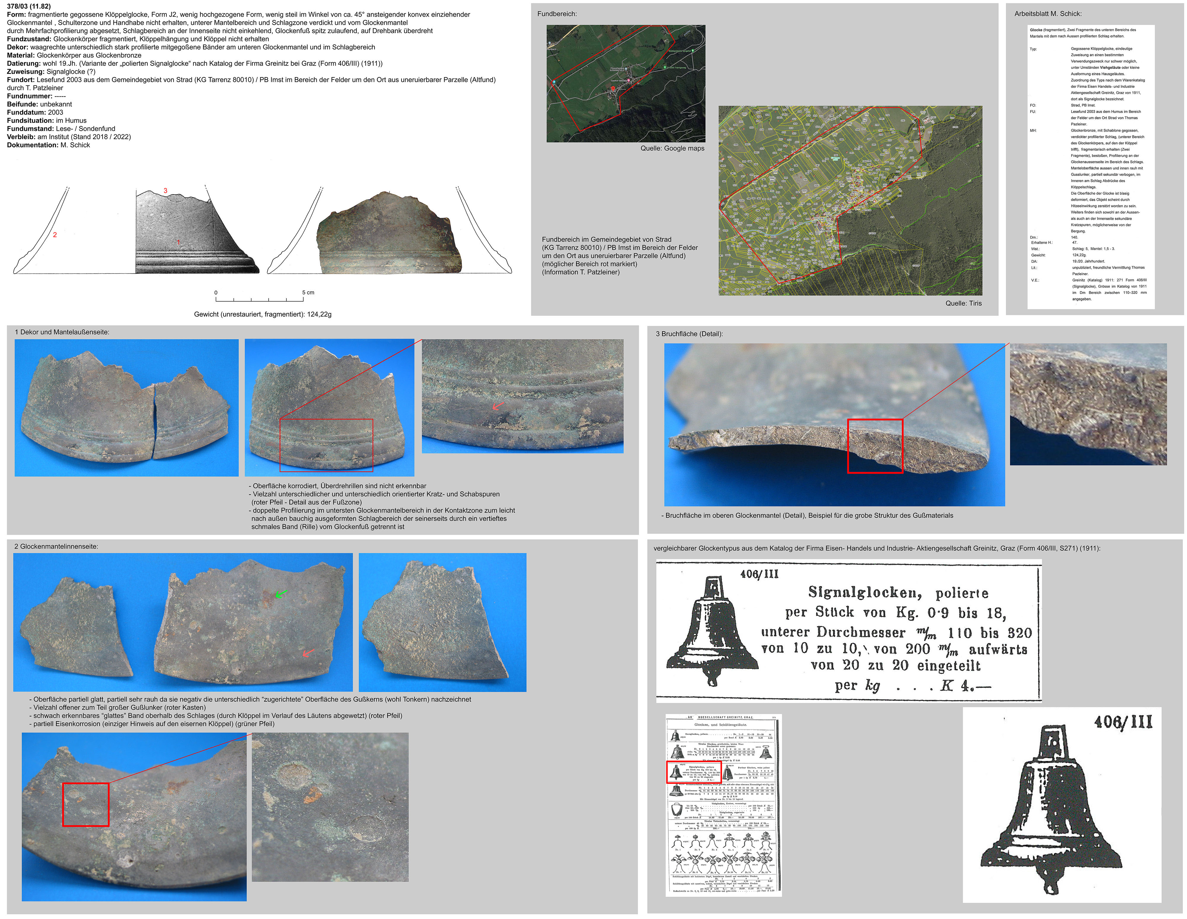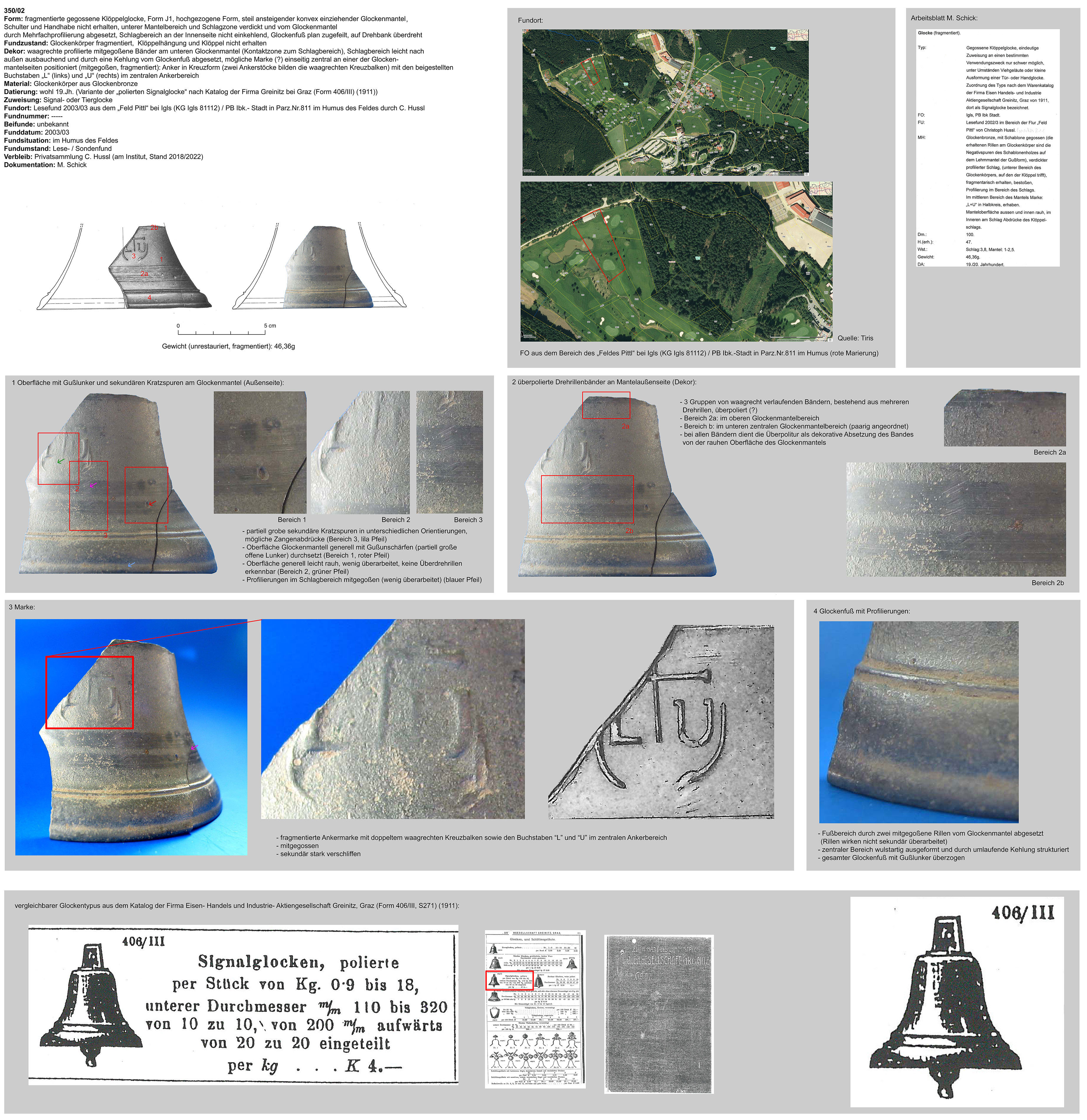 | KG St. Johann im Walde/Osttirol (85031), Parz.Nr.725, Humusfund (Jost) | Tallage (Lesefund) | erhaben mitgegossene Dekorrillen an Mantel und Schlag, erhabene „Marke“ im zentralen Mantelbereich (L und U von zentralem Kreuz/Armbrust getrennt), wohl Herstellermarke | |||