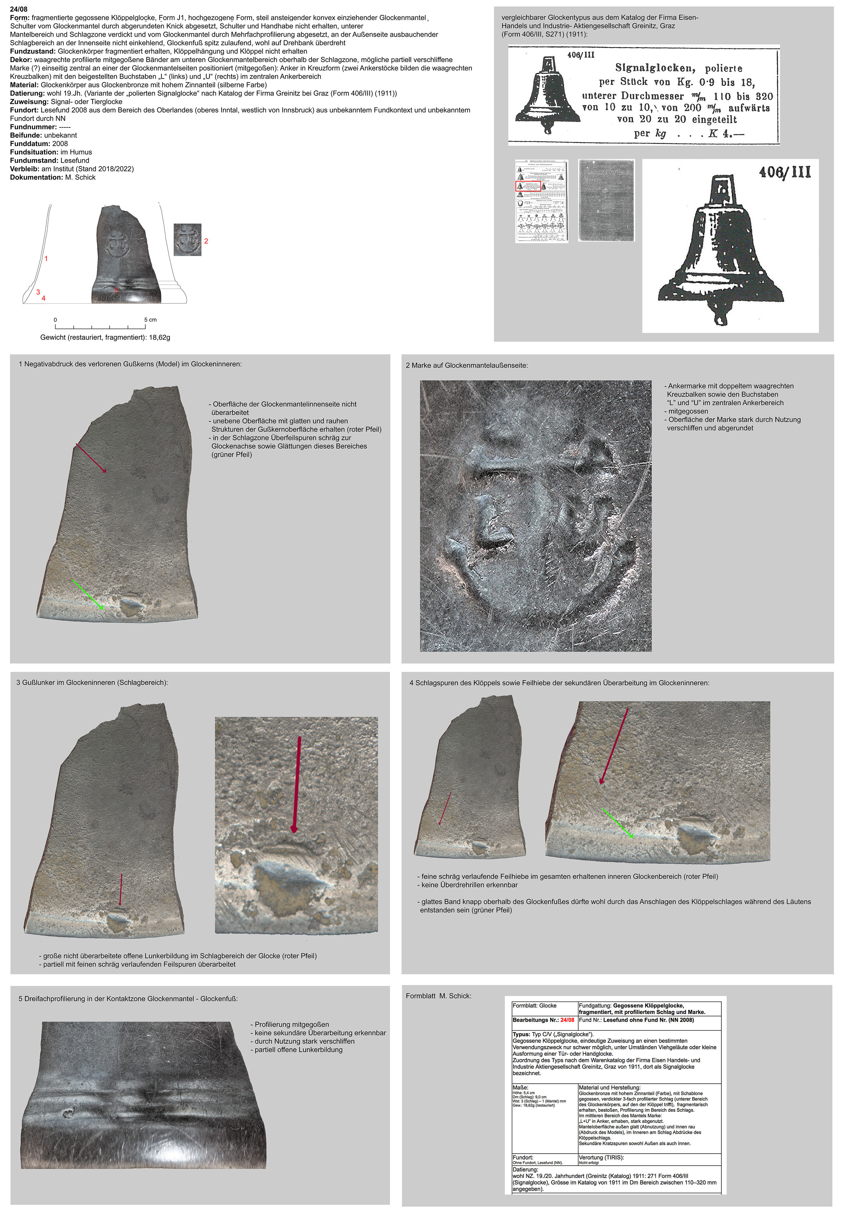 | Igls/Ibk Land, Feld Pittl, Parz.811 (Hussl) | Mittellage (Lesefund) | eingedrehte und erhaben mitgegossene Dekorrillen an Mantel und Schlag, erhabene „Marke“ im zentralen Mantelbereich (L + U), wohl Herstellermarke | |||