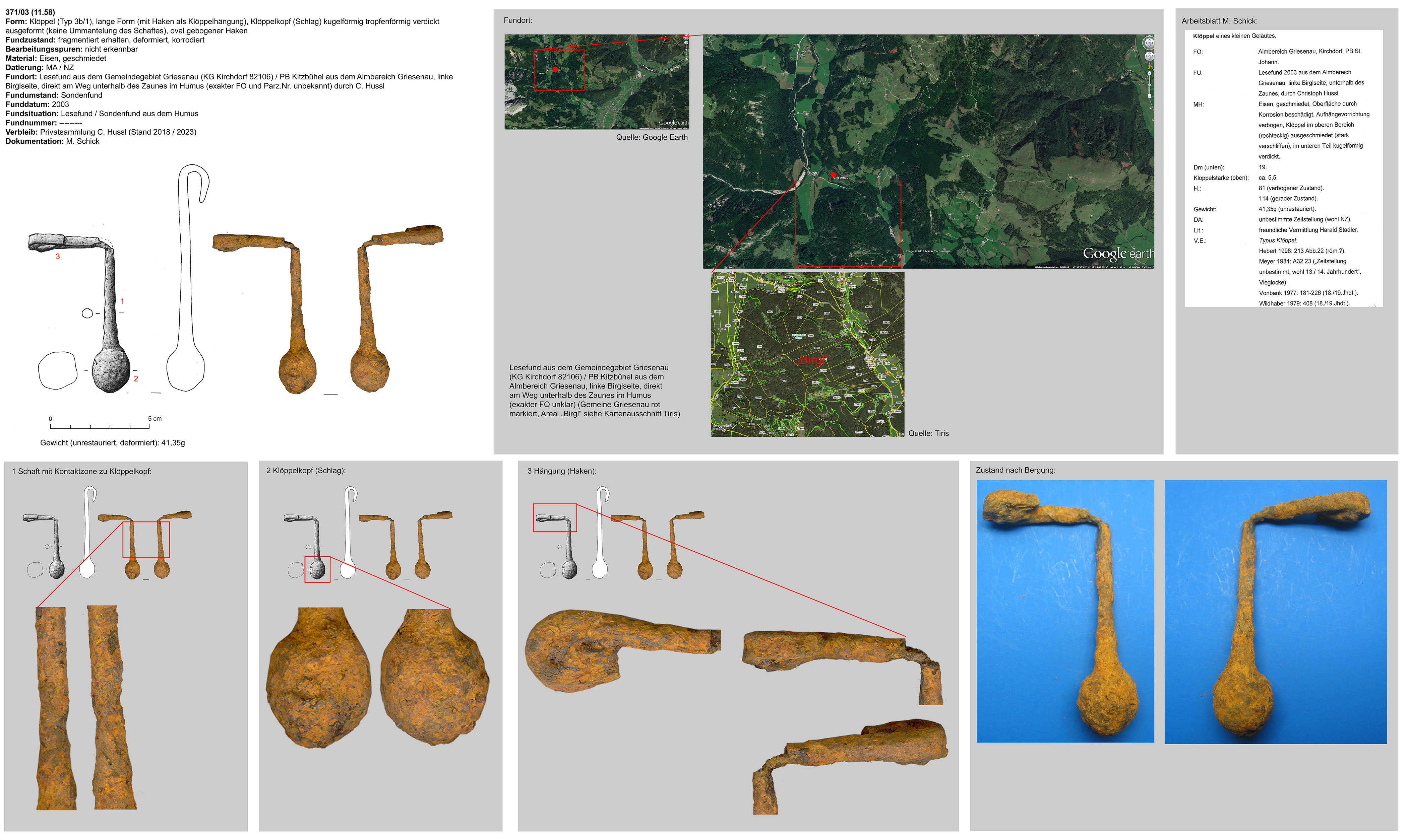 | 371/03 (11.58) | NZ | Lesefund aus dem Gemeindegebiet Griesenau (KG Kirchdorf 82106) / PB Kitzbühel aus dem Almbereich Griesenau, linke Birglseite, direkt am Weg unterhalb des Zaunes im Humus; C. Hussl | ||
