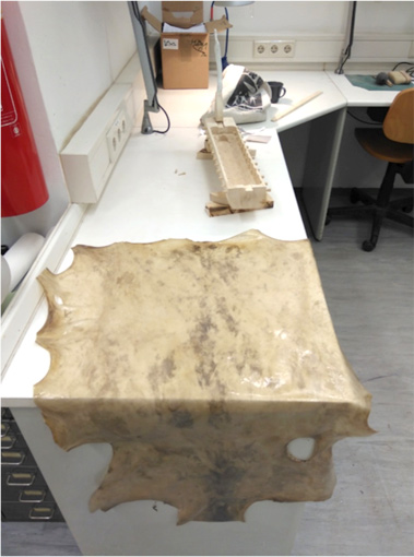 In einem ersten Arbeitsschritt wurde die Rohhaut angepasst und zugerichtet, in einem zweiten als Korpusdeckel aufgesetzt.