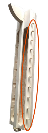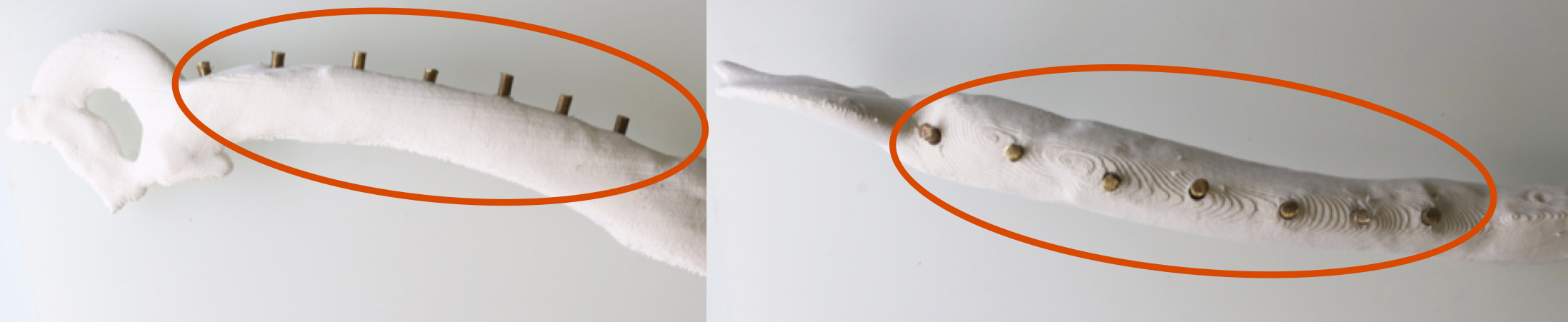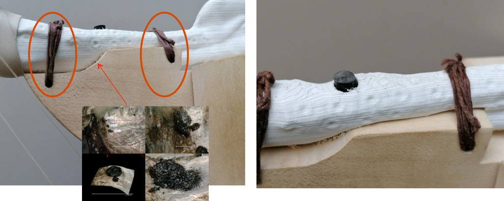 Der 3D Ausdruck liegt am Klangkorpus auf und ist vorerst aussschließlich durch den Eisenstift fixiert. Solange die dunkle Masse nicht durch Untersuchungen eindeutig als Kleber ausgewiesen ist, scheidet die Verwendung eines solchen für den Nachbau aus. Daher musste der Kontaktbereich aus Gründen der Statik durch zwei Bindungen stabilisiert werden, die am Original nicht nachweisbar sind und eine temporäre Lösung darstellen.