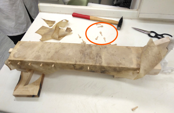in die Rohhautringe eingeschobene Holzstifte am Nachbau (orange Pfeile)