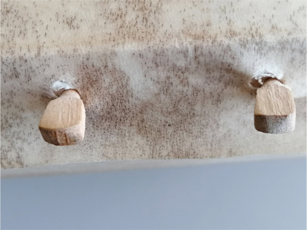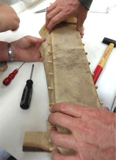 Als zweite Variante scheint aus technischer Sicht eine Fixierung der Rohhaut mit Holzstiften an den Seitenflächen des Korpus am sinnvollsten. Eine zusätzliche Klebung ist in diesem Fall nicht notwendig. Zudem ist die Rohhaut bei einer derartigen Fixierung bei allfälligen Reparaturen sowie beim Saitentausch abnehmbar und kann nach erfolgter Arbeit leicht wieder aufgezogen werden. Bei der ersten Variante ist dies schwieriger, da der Klangkorpus einteilig und einen Zugriff in sein Inneres ohne vollständige Entfernung der Rohhaut nicht möglich ist.
