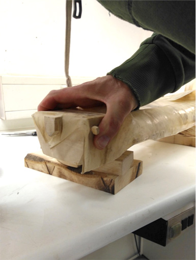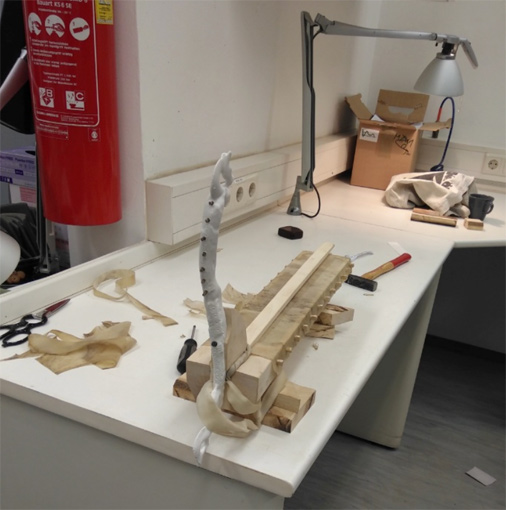 Im nächsten Schritt wurden Hals und Resonanzkörper zusammengefügt. Der Winkel zwischen diesen orientierte sich an den Beobachtungen und Dokumentationen am Fundobjekt, wobei die Lage des inzwischen um 180° gedrehten Eisenstiftes die Zugrichtung des Korpus vorgibt.