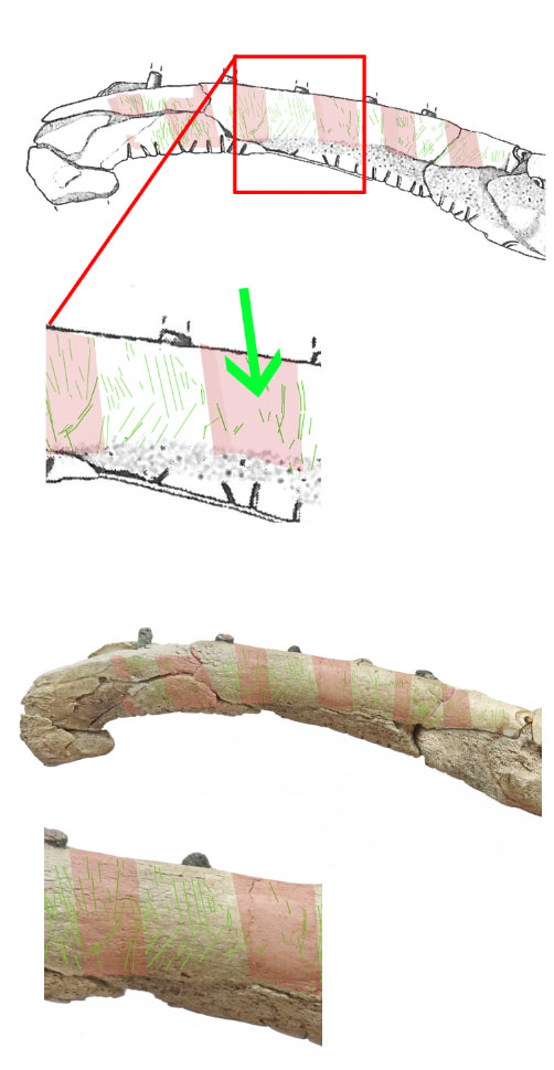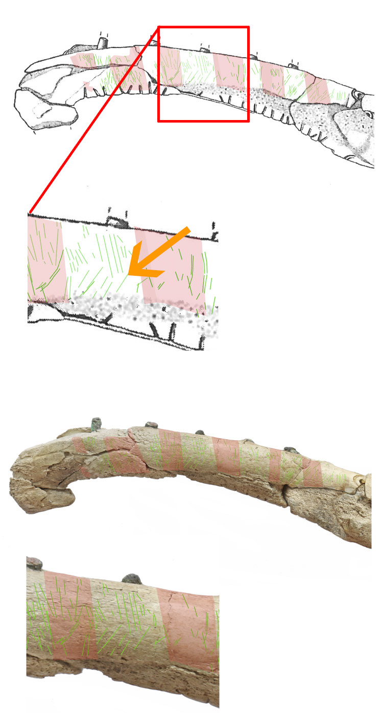 Bei der ersten der drei Gruppen handelt es sich um lange Kratzspuren, die steil von oben nach unten rückwärts verlaufen (oranger Pfeil). Die zweite Gruppe umfasst die leicht schräg um das Geweih verlaufende Politurspuren zwischen den Bronzestiften (rot). Eine dritte Gruppe aus kurzen Kratzspuren (grün) läuft schräg in einem Winkel von ca. 45° zum Geweih.