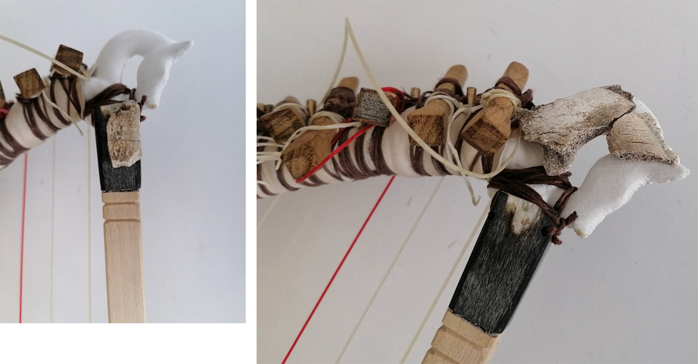 Dies erklärt allerdings nicht die dritte Gruppe der kurzen Kratzspuren, die schräg zu den Politurspuren stehen. Erst durch einen weiteren Vergleich mit einer ostafrikanischen Bogenharfe Ennanga kam die Idee auf, kleine Stäbchen in die Ringe einzuschieben. Diese geben dem angeschlagenen oder gezupften Ton der Saite eine schnarrende Note.5