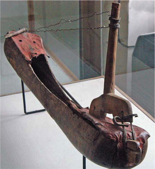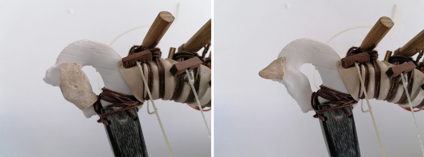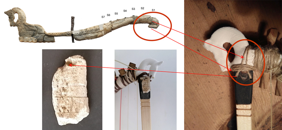 Durch den Vergleich mit rezenten ethnologischen Musikinstrumenten kann angenommen werden, dass die Saiten mittels Knebeln am Hals montiert waren. Diese Knebel sind jeweils im Bereich zwischen zwei fixierten Bronzestiften vertikal frei drehbar, was die erste Gruppe der langen Kratzspuren erklärt.
