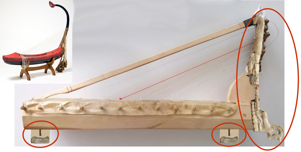 Problematisch gestaltete sich die Wahl des Saitenmaterials. Nach eingehenden Diskussionen fiel die vorläufige Entscheidung zugunsten von Harfensaiten aus Darm, wie sie auch für kleine Rahmenharfen benutzt werden. Weitere Materialien wie Pflanzenfasern oder insbesonders Pferdehaare stehen zur Diskussion und sollen bei kommenden Nachbauten getestet werden. Pferdehaare als Instrumentensaiten haben neben der Besaitung von Bögen für Streichinstrumente eine lange Tradition. Als Beispiel sei die mongolische Pferdekopfgeige (morin chuur) , eine zweisaitige Kastenspießlaute genannt, die zudem ebenfalls mit Pferdeköpfen verziert ist. Eine einzelne Saite besteht aus 100 bis 130 einzelnen Haaren eines Pferdeschweifes, die untereinander keinen Zusammenhalt haben, weder miteinander versponnen noch umwickelt sind.