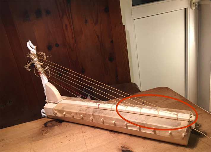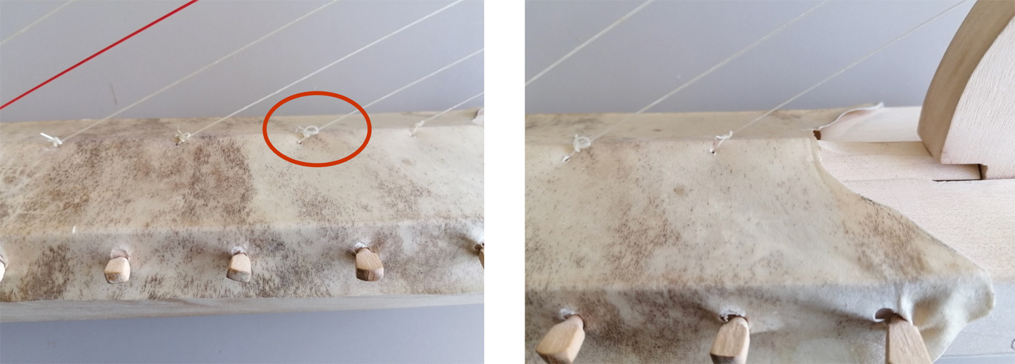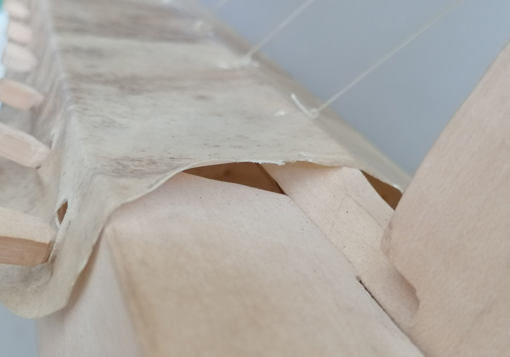 Bei dieser Harfe liegt der Saitenhalter nicht auf, sondern unter der noch in situ fixierten Rohhaut. Diese ist für die Befestigung der Saiten am Holzstab perforiert. Beim Spielen wird das Holz stark gegen die Rohhaut nach oben gedrückt und diese gespannt, was eine Schwingungsübertragung bestens gewährleistet.