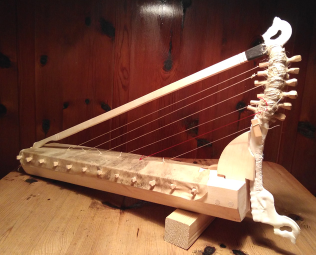 Die Entscheidung für eine Bespannung des ausgehöhlten Holzkorpus mit Rohhaut ergab sich aus den archäologisch geborgenen Beispielen von Winkelharfen aus Ägypten und Zentralasien.