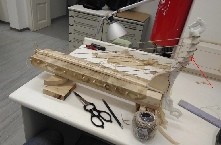 In Anlehnung an Pazyrik und den entsprechenden Umbau von Lawergren wurden die Saiten an einem Saitenhalter fixiert, einem längsrechteckigem schmalen Holzstab, der direkt auf der Rohhaut auflag. An der Oberseite des vorderen Halsbereichs des Originals sind in den Arealen zwischen den Bronzestiften leicht eingetiefte Politurspuren erkennbar, die durch Wicklungen für die Saitenaufnahme entstanden sein könnten. Dementsprechend wurden in einem ersten Schritt Rohhautringen am Hals fixiert, an denen Schnüre in Position der Saiten justiert wurden.