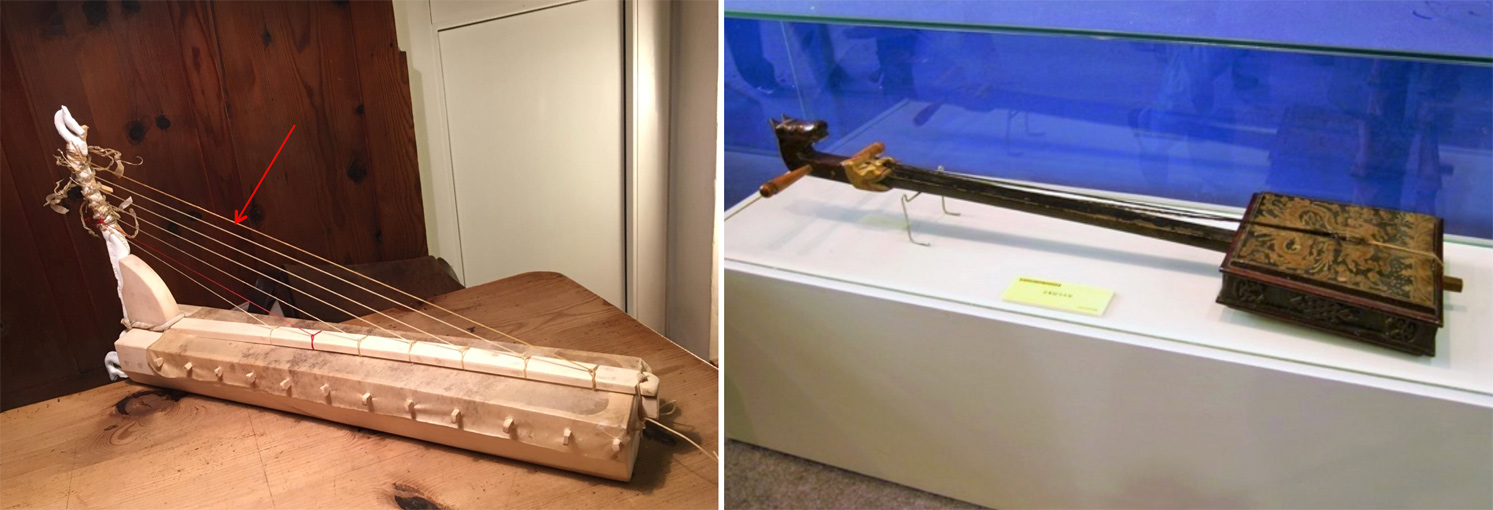 Eine Saitenfixierung unter der Bespannung findet sich aber nicht nur bei ägyptischen Funden, wie die Winkelharfe von Yanghai4 aus dem nördlichem Tarim Becken in China beweist. Hier wird angenommen, dass die nicht mehr erhaltenen Saiten durch die Rohhaut hindurch geführt und unter dieser mit einer Knüpfung oder einem Plättchen fixiert waren.