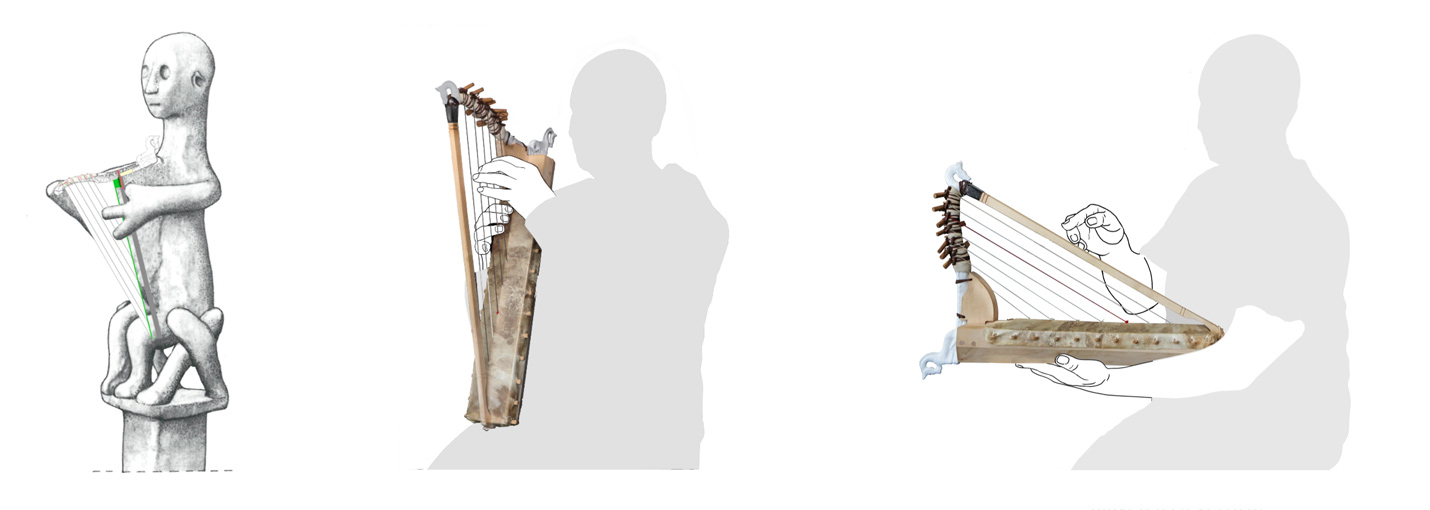 Als Vorlage für die Grundform des ausgestemmten Holzblocks dienten die archäologisch geborgene Winkelharfen aus Pazyrik und Ägypten, deren Korpora entweder abgerundete oder eckige Ausführungen zeigen. Da keine genaue Kopie dieser Instrumente angestrebt war, wurde der Nachbau mit relativ dicker Wandstärke hergestellt und die Seiten abgeflacht.