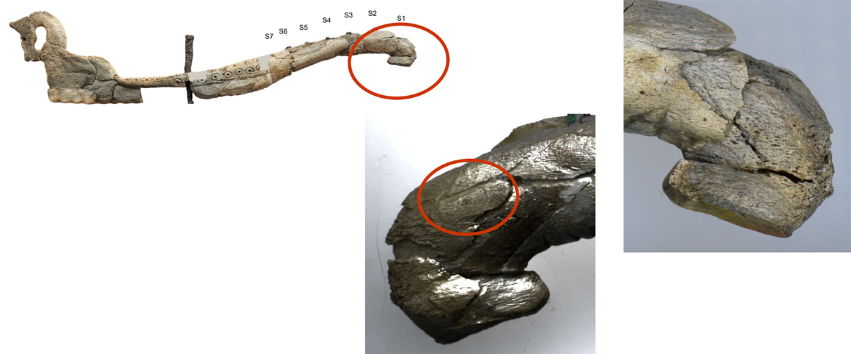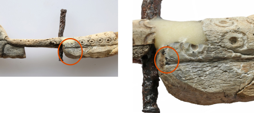 Vor dem Eisenstift ist an der Unterseite des Geweiharms ein abgerundeter Bereich erkennbar. Diese Abrundung dürfte den vorderseitigen Abschluss der Verzapfung des Korpus mit dem Hals darstellen. Spuren einer in zähflüssigem Zustand erstarrten Masse sind wahrscheinlich als Rudimente eines Klebstoffs interpretierbar.