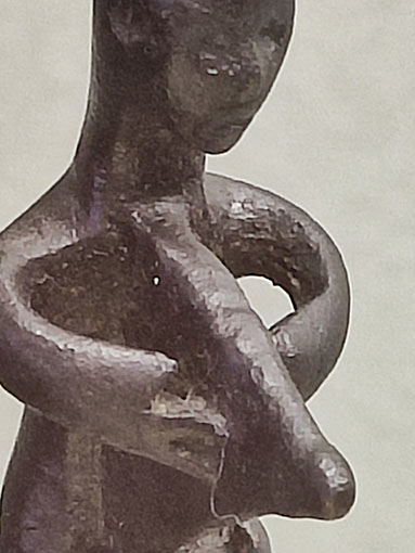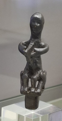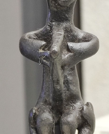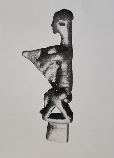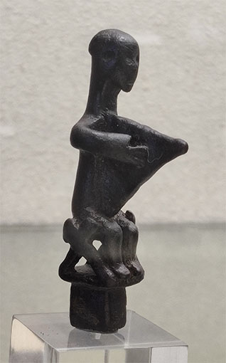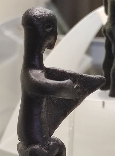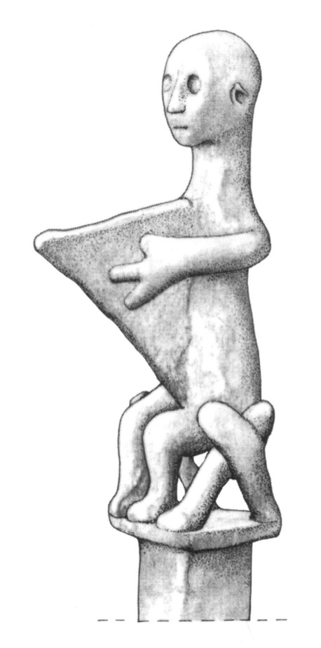 Die auf einem Klapphocker sitzende Figur hält ein dreieckiges Instrument direkt vor der Brust. Im Museumskatalog 5 wird das Instrument zwar als solches erkannt, aber fälschlich als Syrinx interpretiert.
