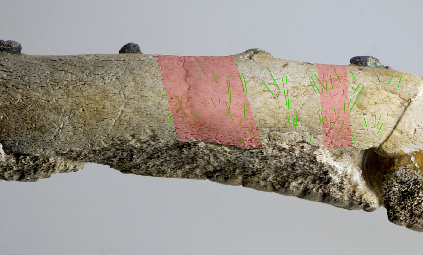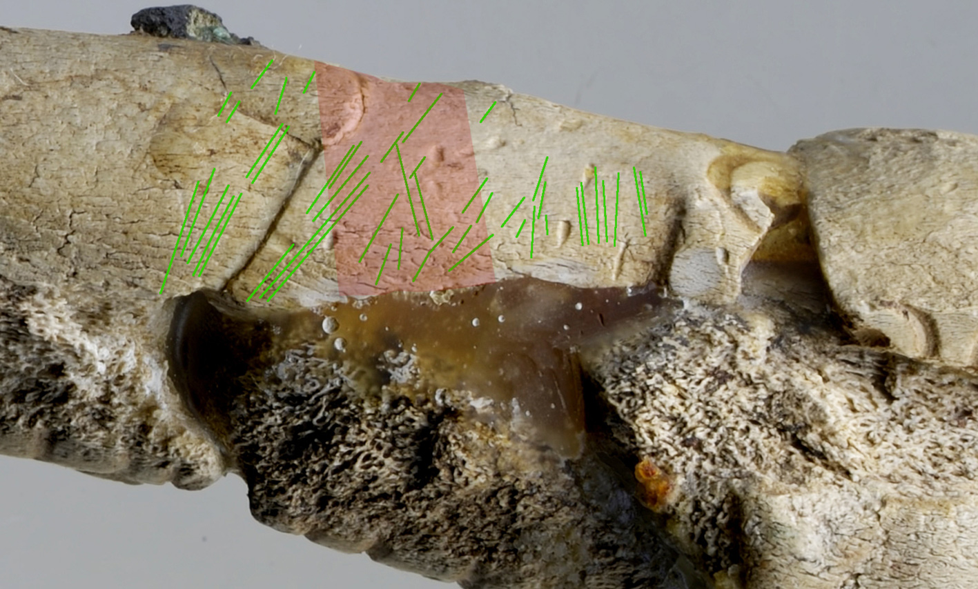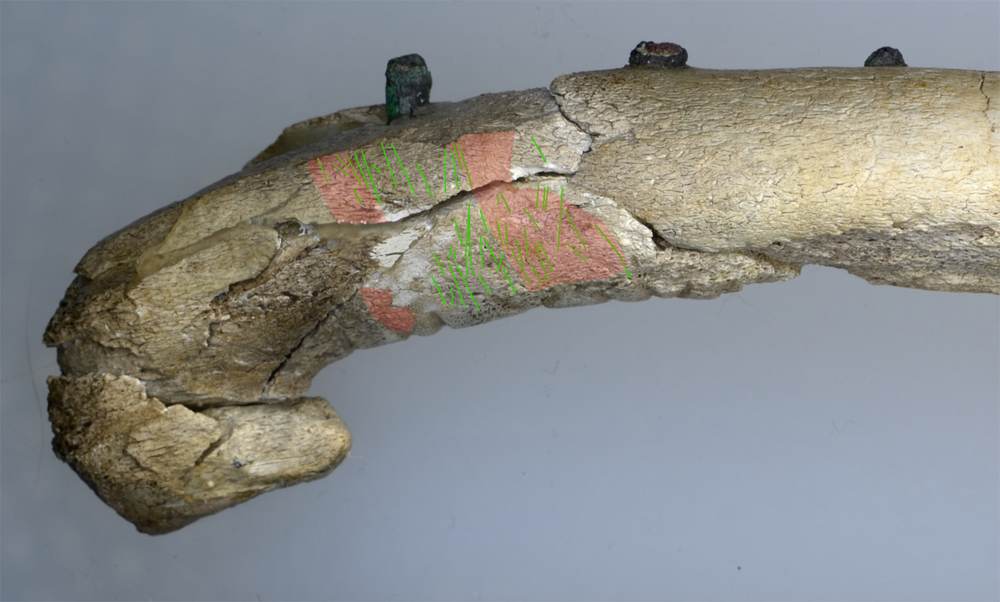 Es ist eine Vielzahl von Spuren am Geweih festzustellen, die entweder im Zuge der Bearbeitung (indentionelle Spuren) oder im Zuge der Nutzung (sekundäre Spuren) entstanden sind. Sie setzten sich aus einer Fülle von „Politurbereichen“ sowie Kratz- und Schabspuren in unterschiedlichen Orientierungen zusammen. Eine farblich auf die Form und mögliche Entstehung dieser Spuren abgestimmte Kartierung sowohl auf der fotographischen als auch auf der gezeichneten Darstellung ermöglicht einen übersichtlicheren und interpretativen Zugang.