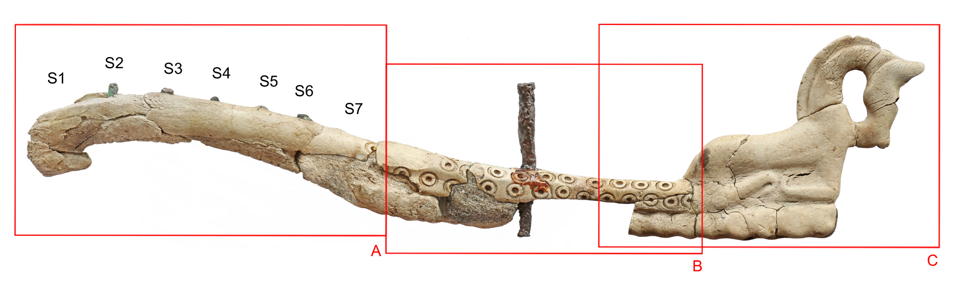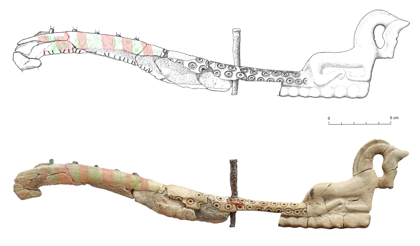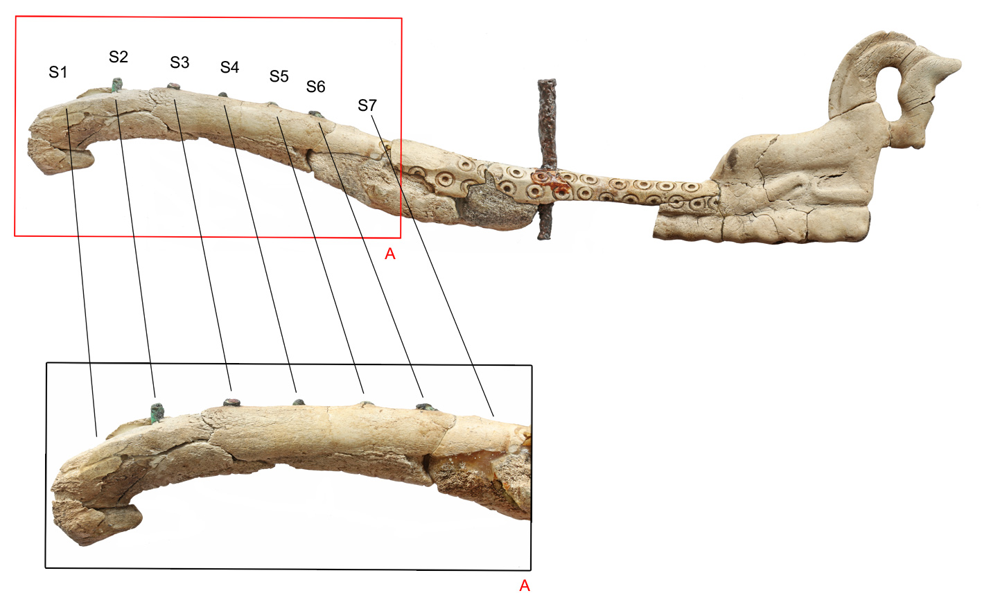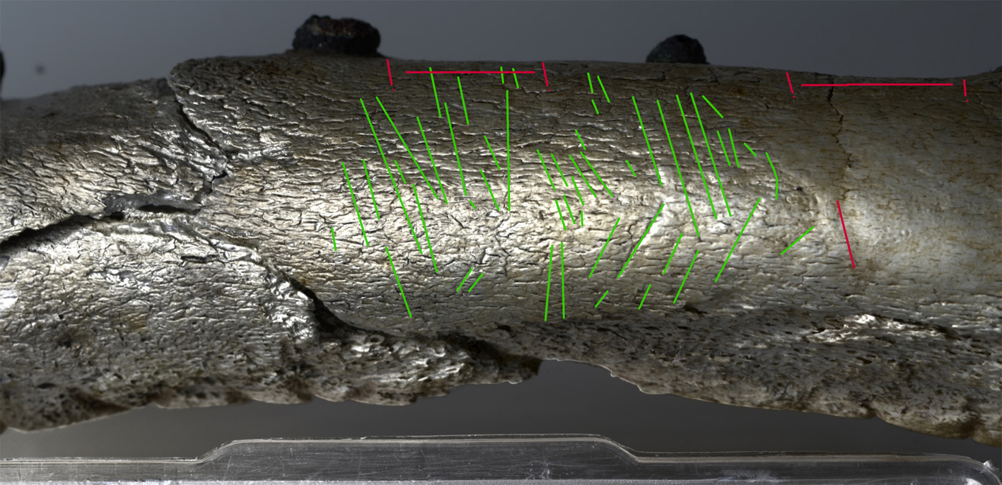 Es ist eine Vielzahl von Spuren am Geweih festzustellen, die entweder im Zuge der Bearbeitung (indentionelle Spuren) oder im Zuge der Nutzung (sekundäre Spuren) entstanden sind. Sie setzten sich aus einer Fülle von „Politurbereichen“ sowie Kratz- und Schabspuren in unterschiedlichen Orientierungen zusammen. Eine farblich auf die Form und mögliche Entstehung dieser Spuren abgestimmte Kartierung sowohl auf der fotographischen als auch auf der gezeichneten Darstellung ermöglicht einen übersichtlicheren und interpretativen Zugang.