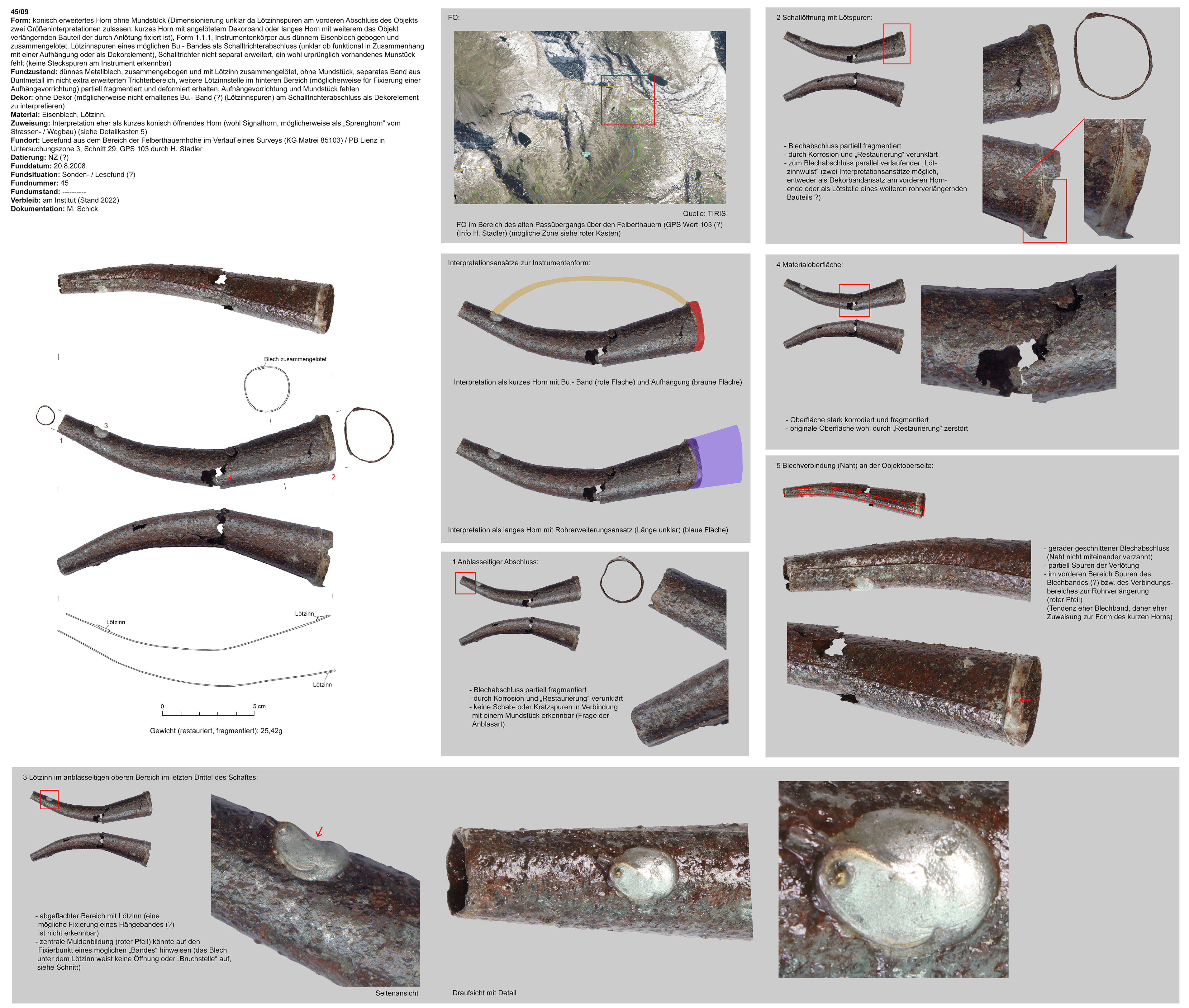 konisch erweitertes Horn ohne Mundstück (Dimensionierung unklar, da Lötzinn-spuren am vorderen Abschluss des Objekts zwei Größeninterpretationen zulassen: kurzes Horn mit angelötetem Dekorband oder langes Horn mit weiterem, das Objekt verlängerndem Bauteil, der durch Anlötung fixiert ist), Instrumentenkörper aus dünnem Eisenblech gebogen und zusammengelötet, Lötzinnspuren eines möglichen Bu-Bandes als Schalltrichter-abschluss (unklar, ob funktional in Zusammenhang mit einer Aufhängung oder als Dekorelement), Schalltrichter nicht separat erweitert, ein wohl urprünglich vorhandenes Mundstück fehlt (keine Steckspuren am Instrument erkennbar) |