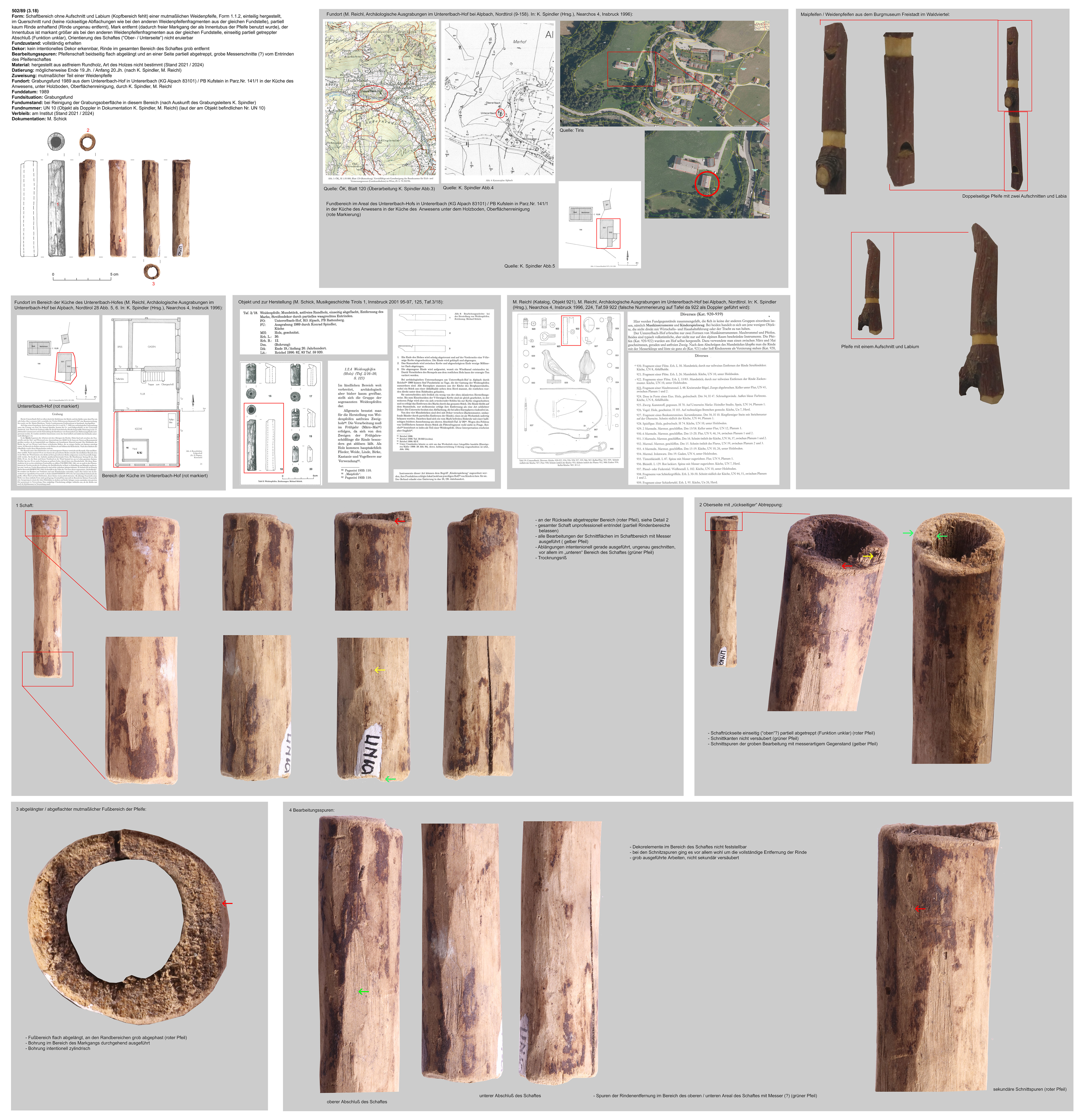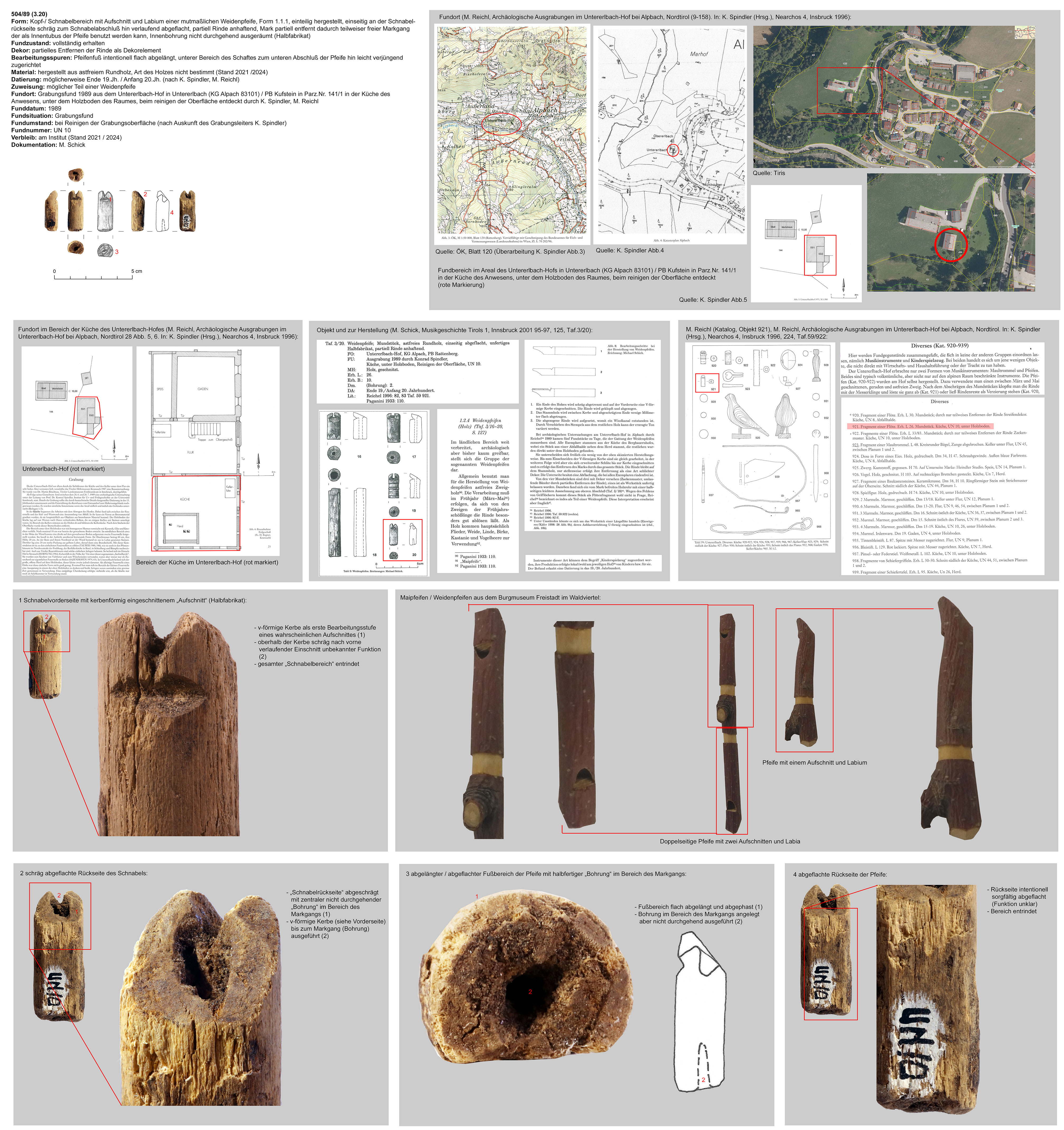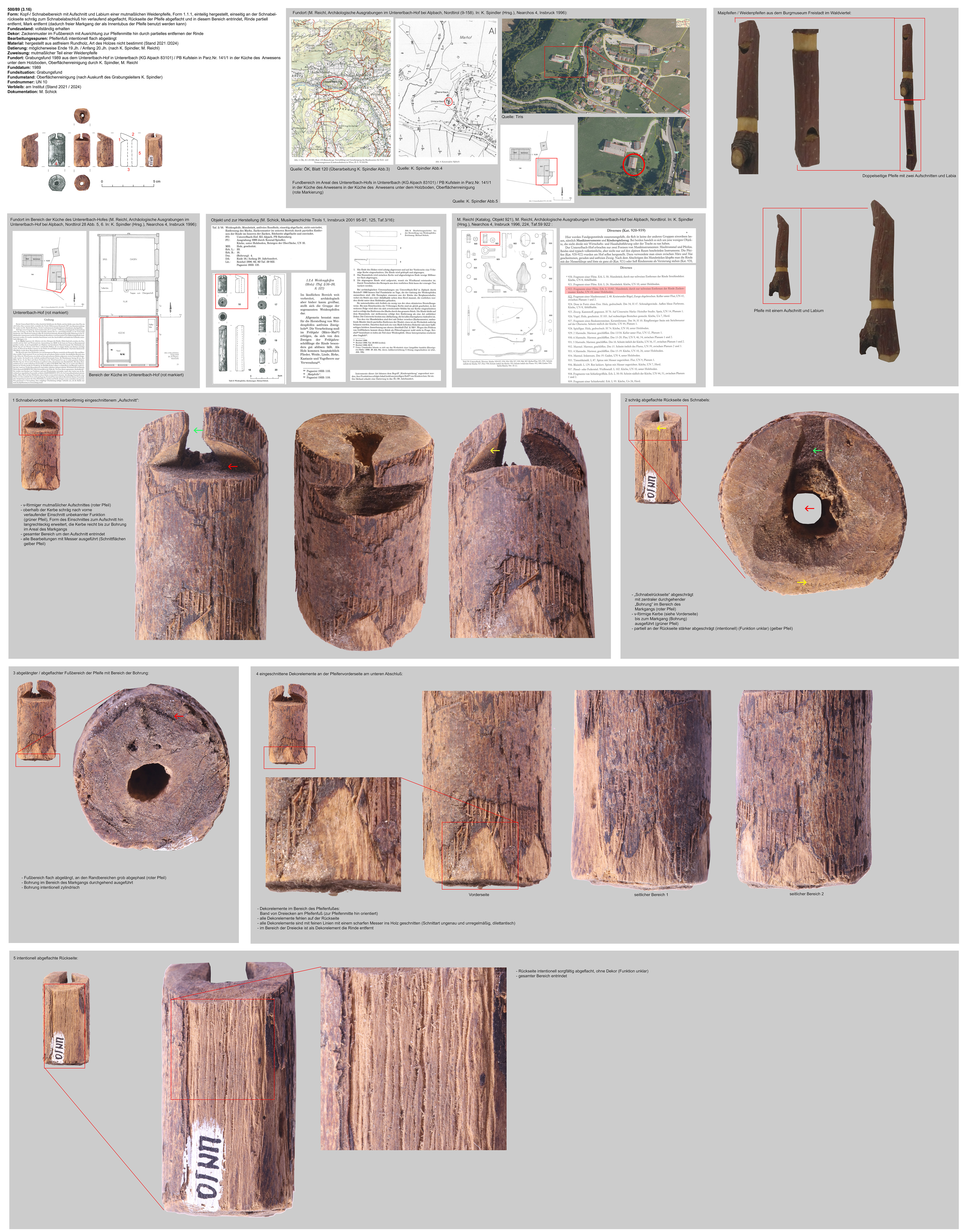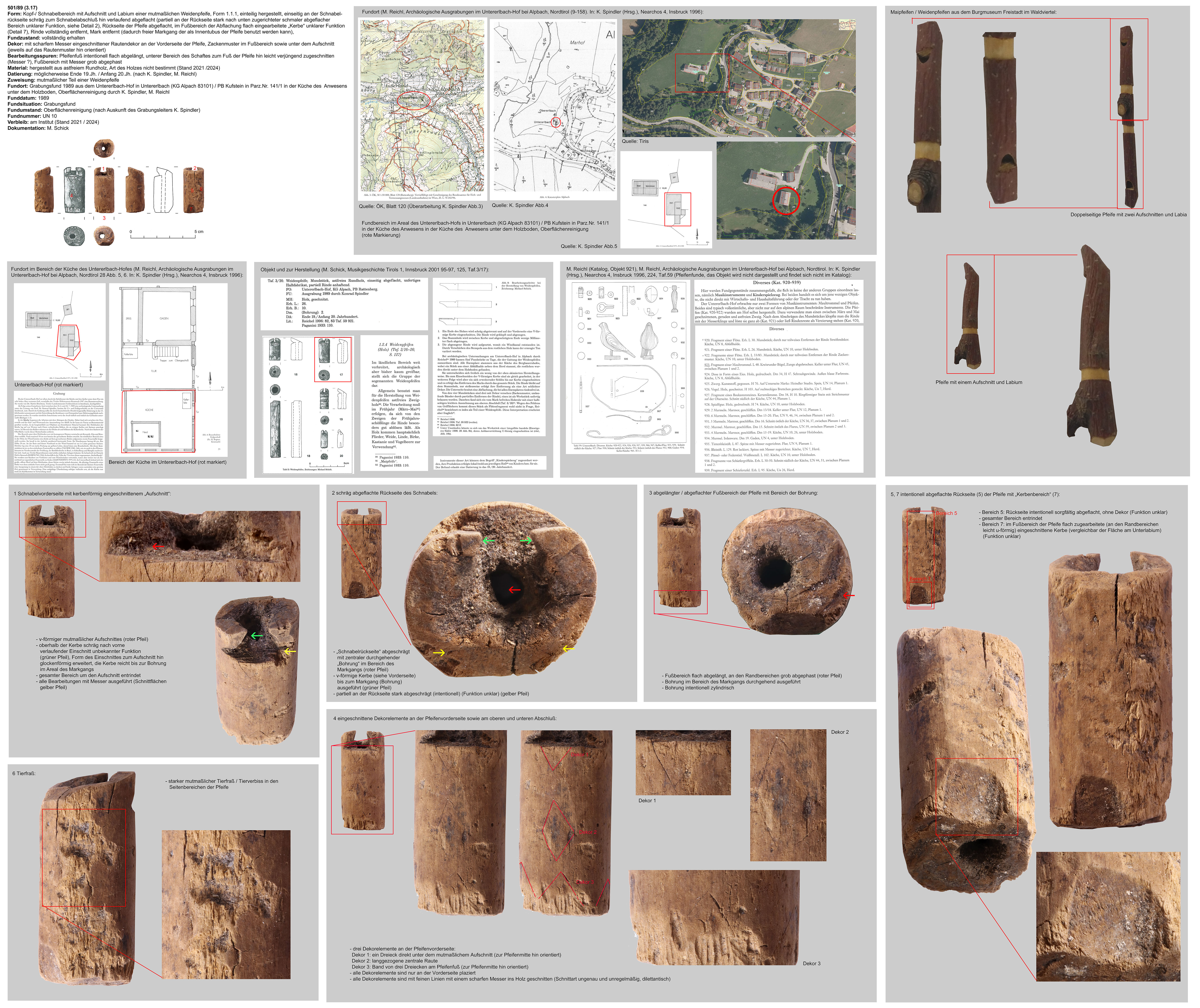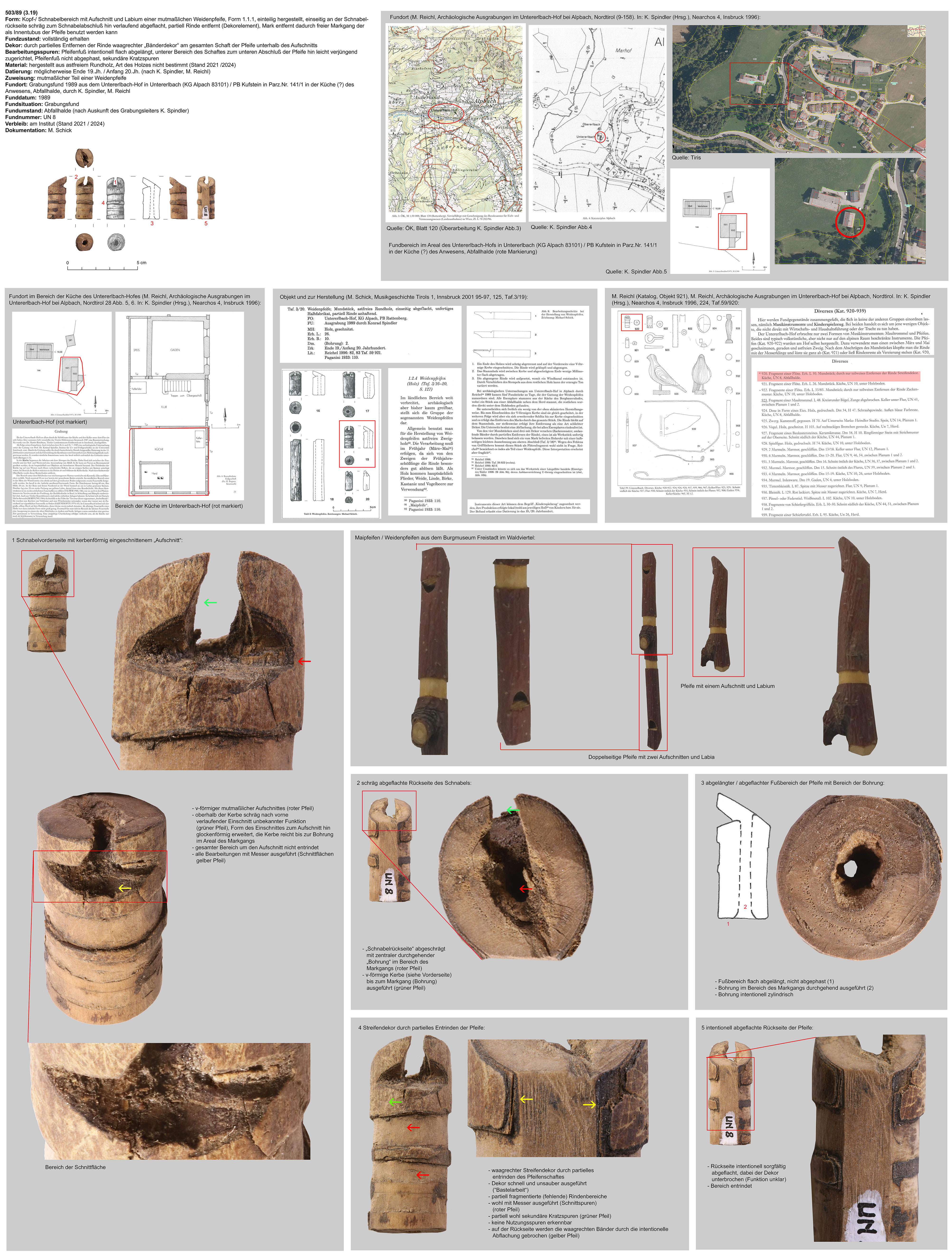 | 503/89 (3.19) | vollständig erhaltener Kopf mit Aufschnitt und Labium, partiell entrindet (Dekor), an der Kopfseite abgeschrägter Schnabelbereich, Rückseite abgeflacht | partiell entrindetes Astholz, Holzart derzeit nicht bestimmt (Stand 2021/2024) | erh.L.: 83mm, erh.B.: 14mm, Dm. (Bohrung): 8mm | Mai-/ Weidenpfeife, mutmaßlich als Kinderinstrument / Spielzeug benutzt | möglicherweise Ende 19.Jh. / Anfang 20.Jh. (nach K. Spindler, M. Reichl) | Mittellage, Grabungsfund 1989, Untererlbach-Hof in Untererlbach (KG Alpach 83101) / PB Kufstein in Parz.Nr. 141/1 in der Küche (?) des Anwesens, Abfallhalde; K. Spindler, M. Reichl | waagrechtes Bänderdekor am Tubusbereich der Pfeife unter dem Aufschnitt |
