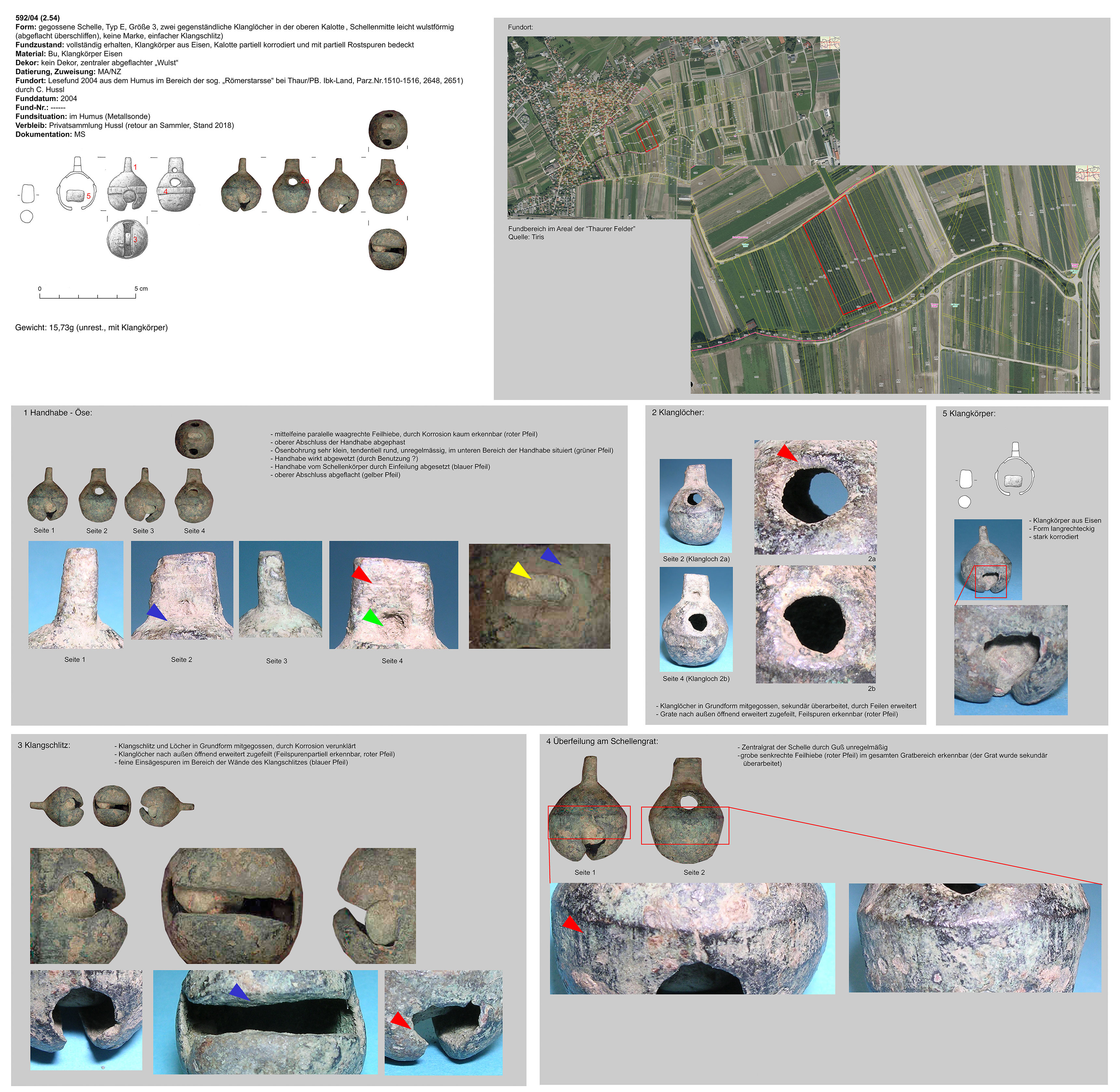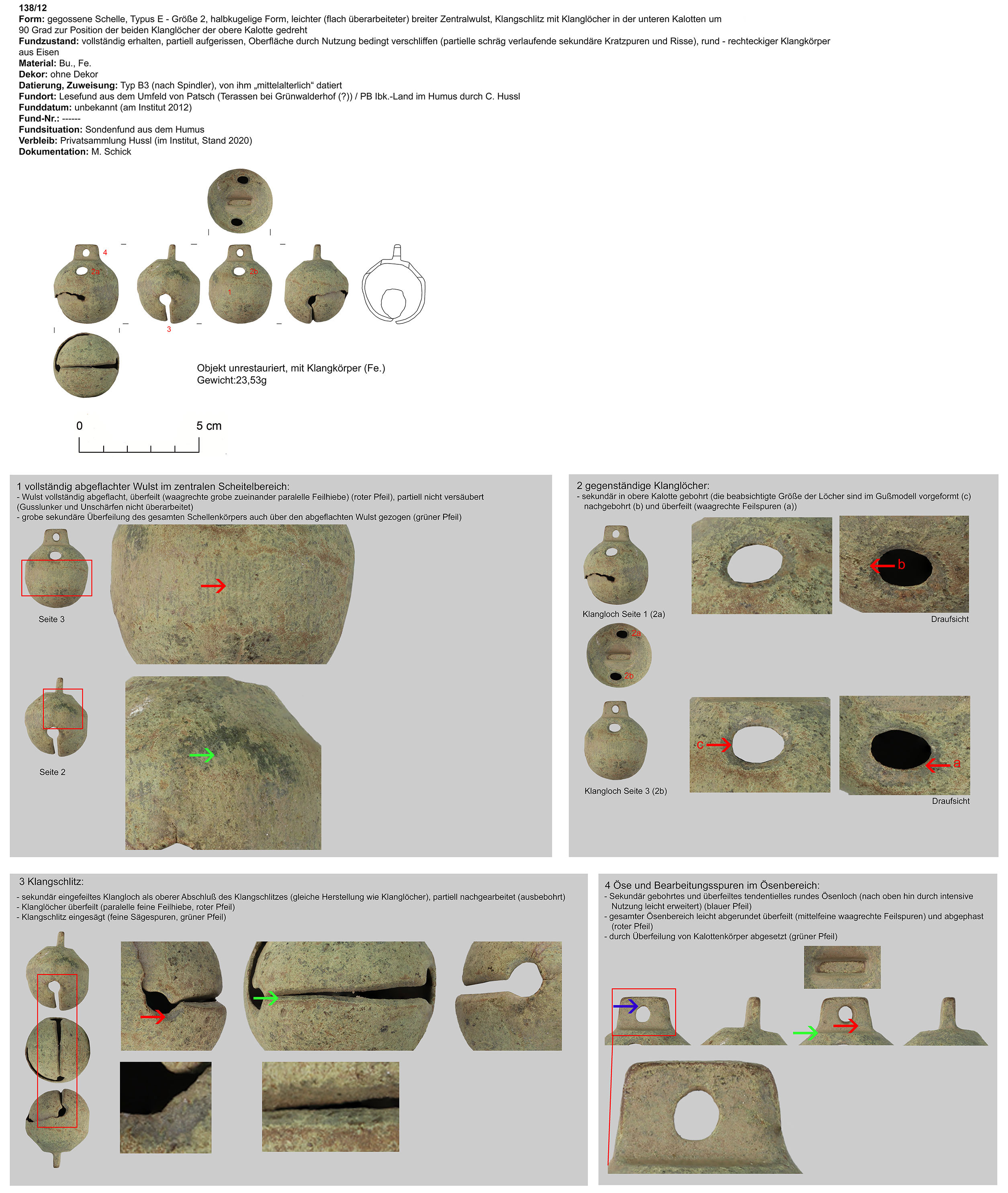 Formale Kriterien: einteilig, 2 gegenständige Klanglöcher in oberer Kalotte, zentraler leichter Wulst (abgeflacht, überschliffen), einfacher Klangschlitz; weder Marke noch Dekor