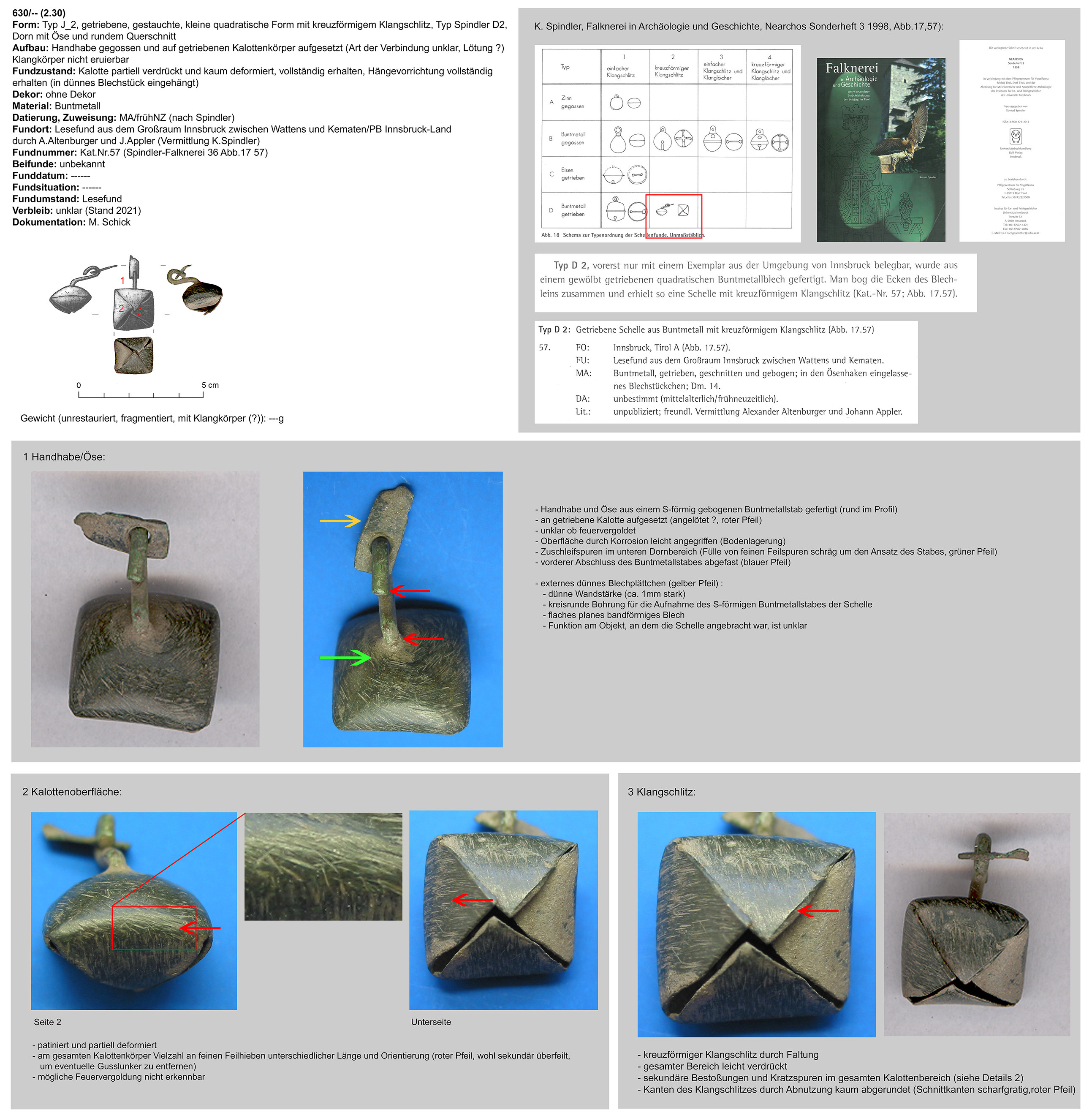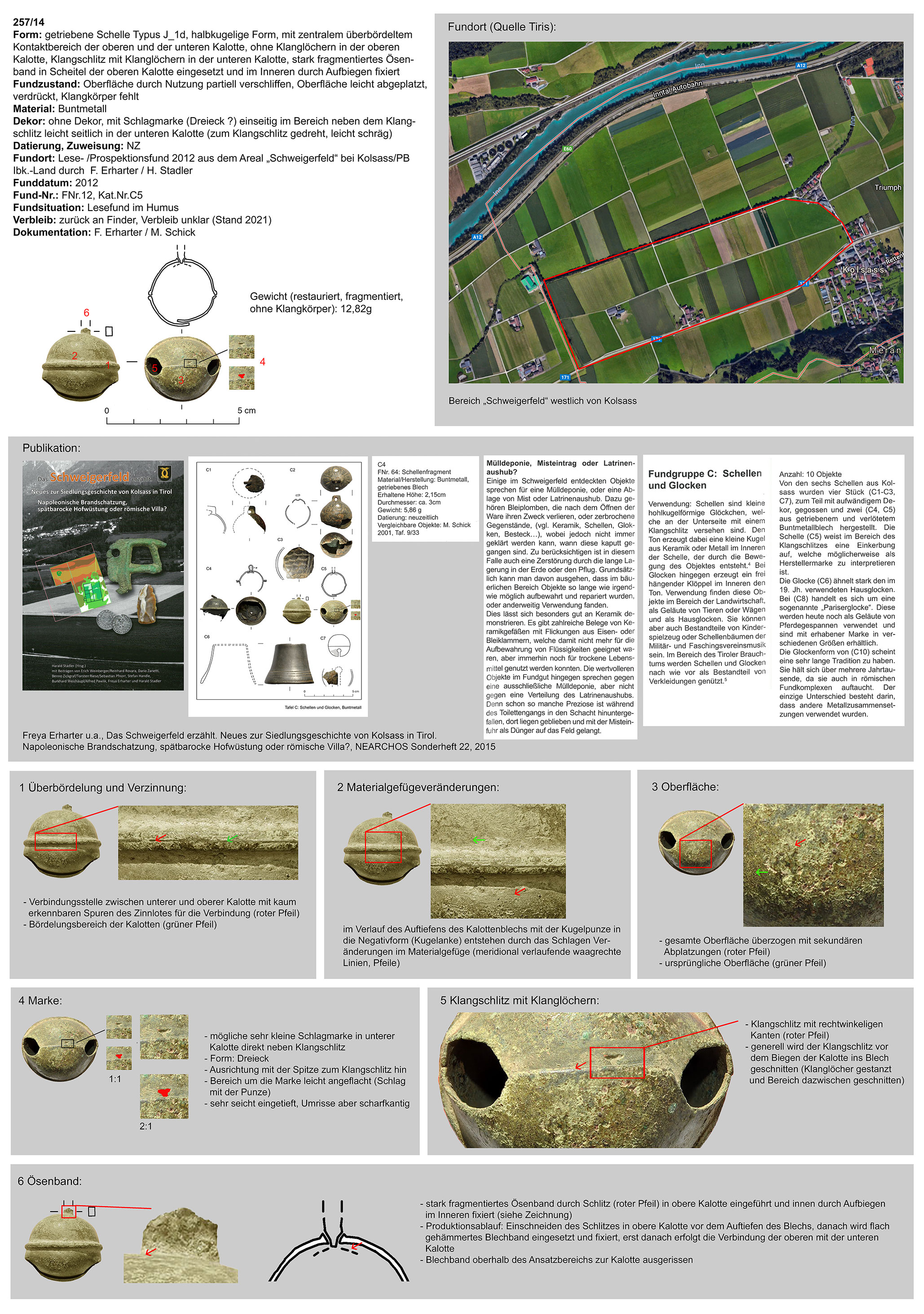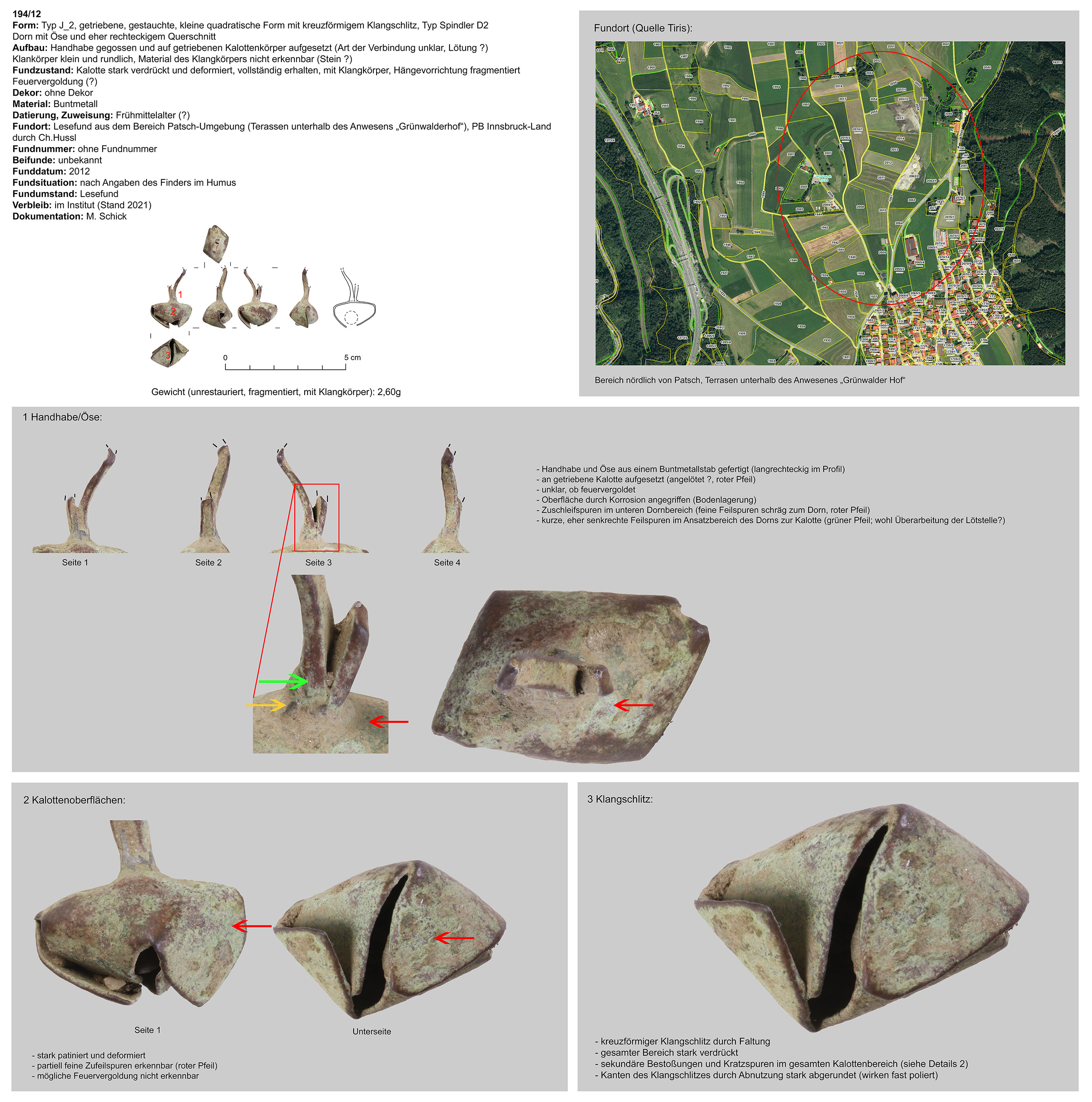 | 187/12 | nicht erhalten | Patsch, Felder (Ch. Hussl) | Mittellage/Humus (Lesefund) | kreuzförmige Marke direkt neben dem Klangschlitz | |