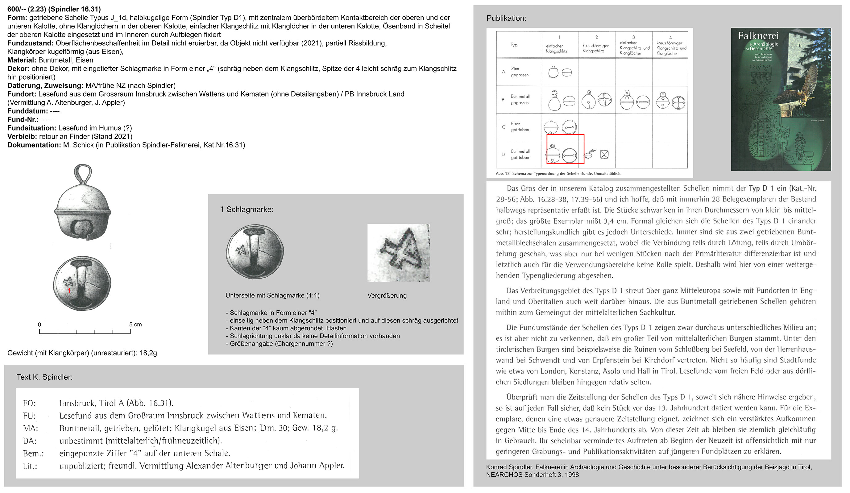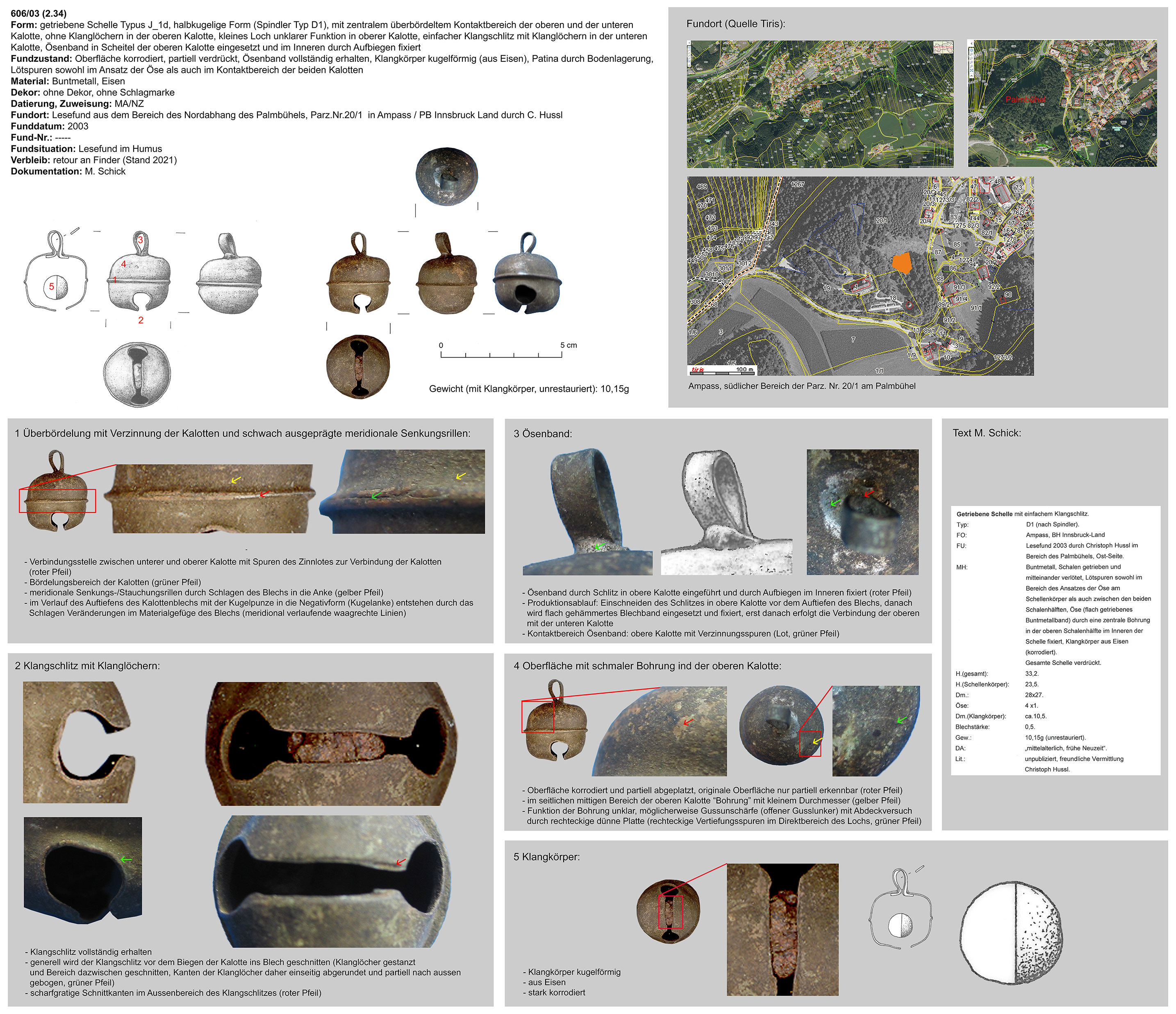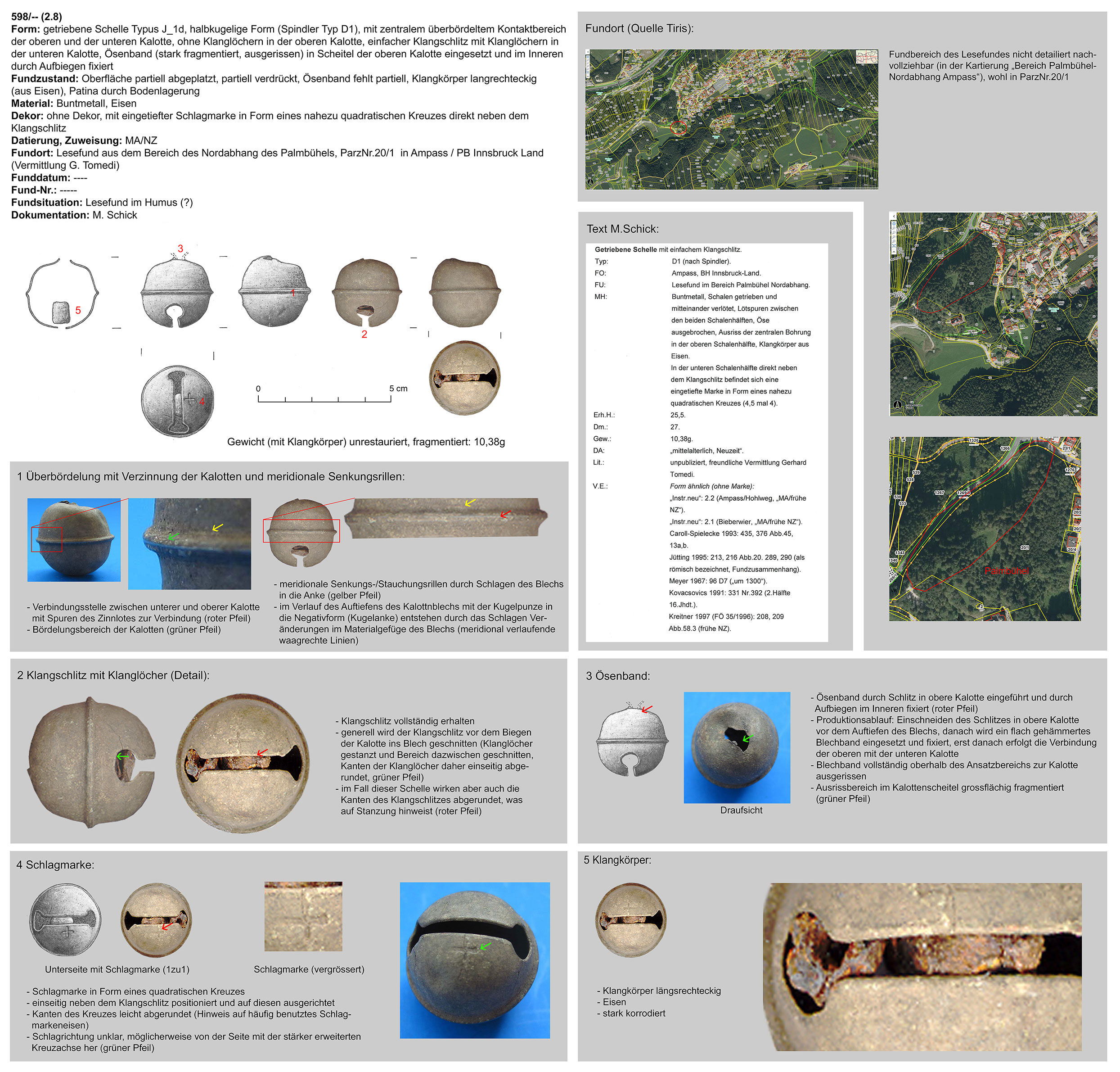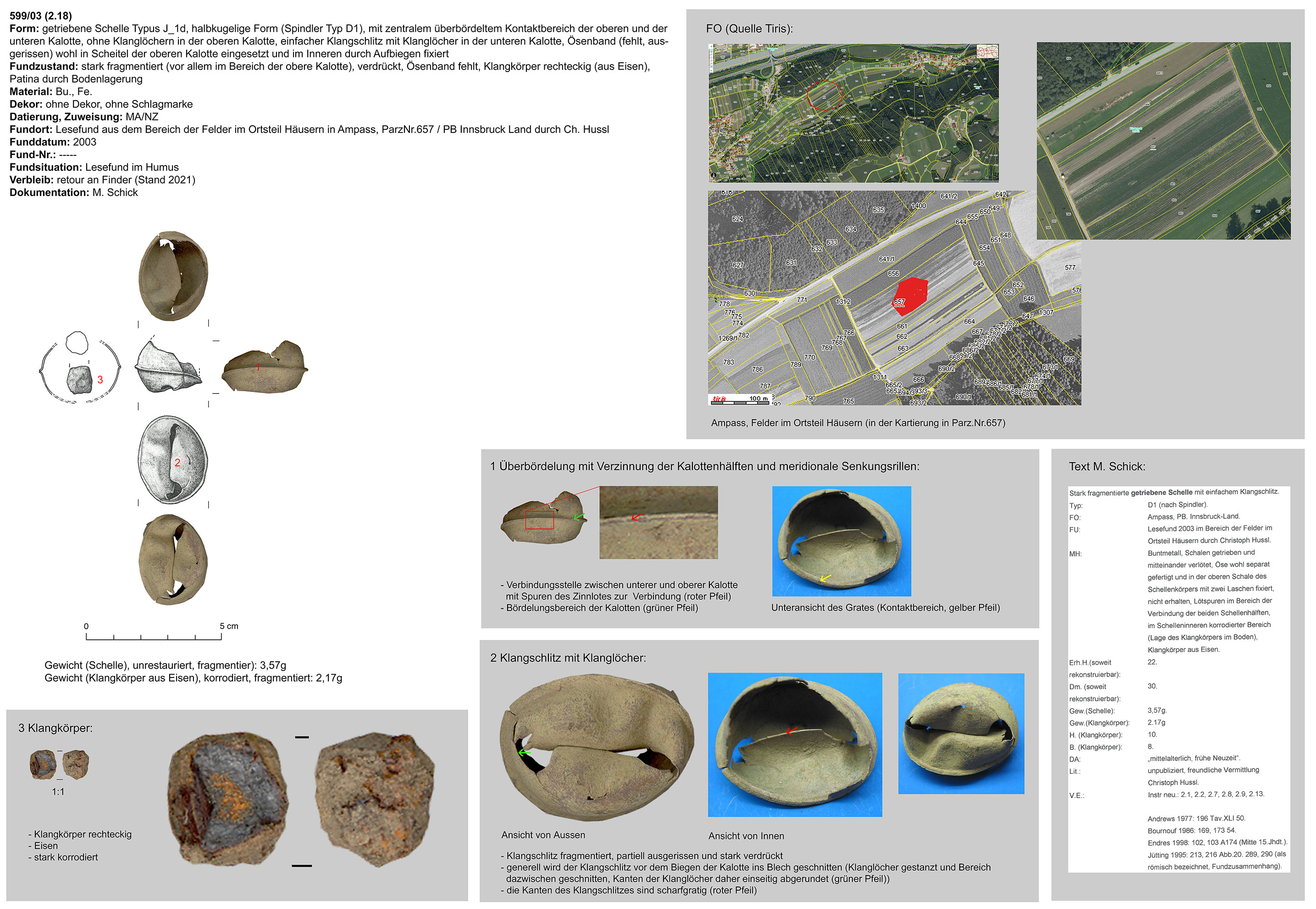 | 214/12 | rund, Eisen | Grobbichl, Thaur (H. Stadler) | Mittellage/Humus (Prospektionsfund) | Marke „Hufeisen“ oder „Omega“ neben Klangschlitz in unterer Kalotte (vom Klangschlitz weggedreht) | |