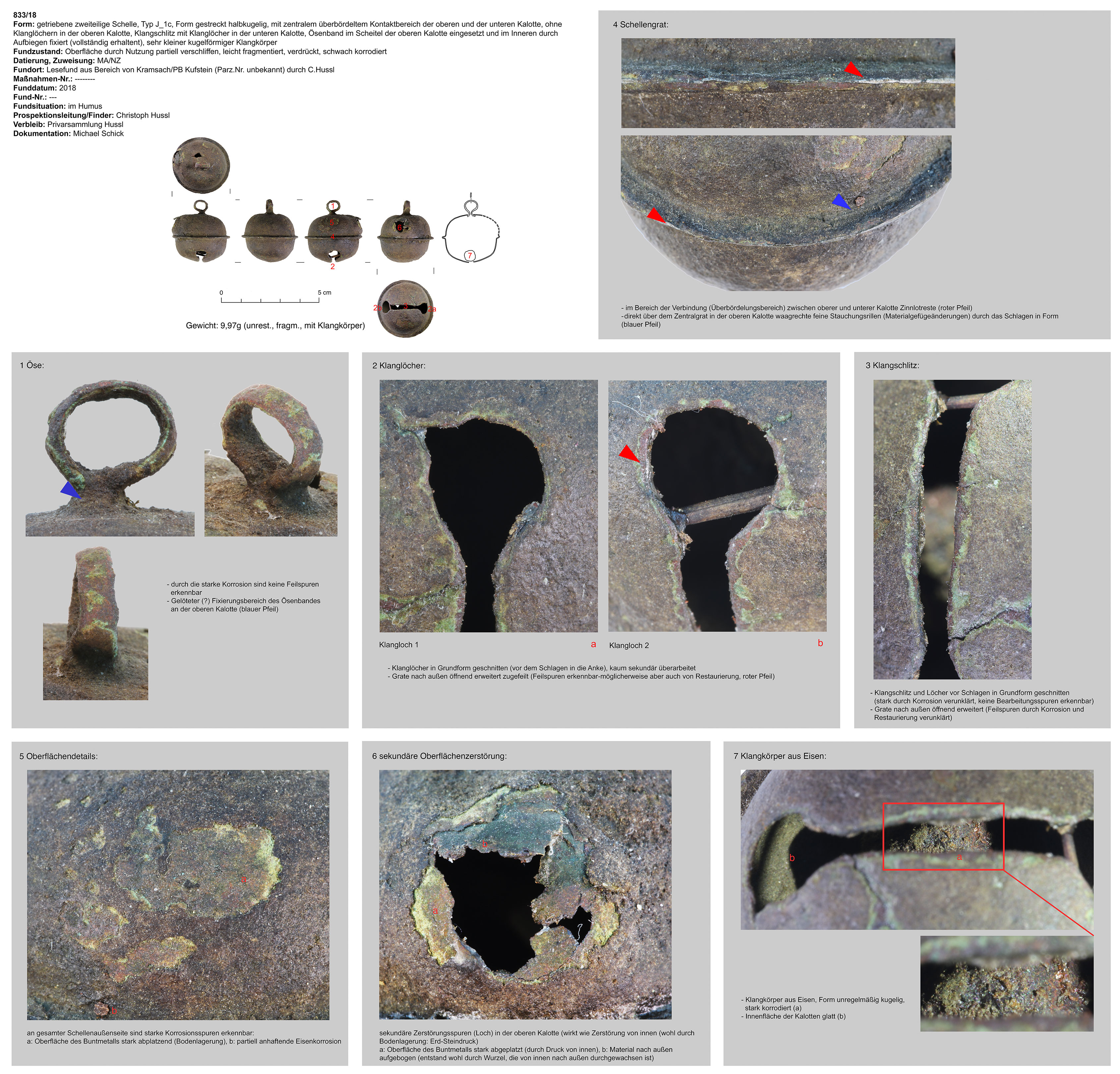 | 833/18 | kugelförmig, Eisen | Umfeld Kramsach (Ch. Hussl) | Tallage/Humus (Lesefund) | ohne | |