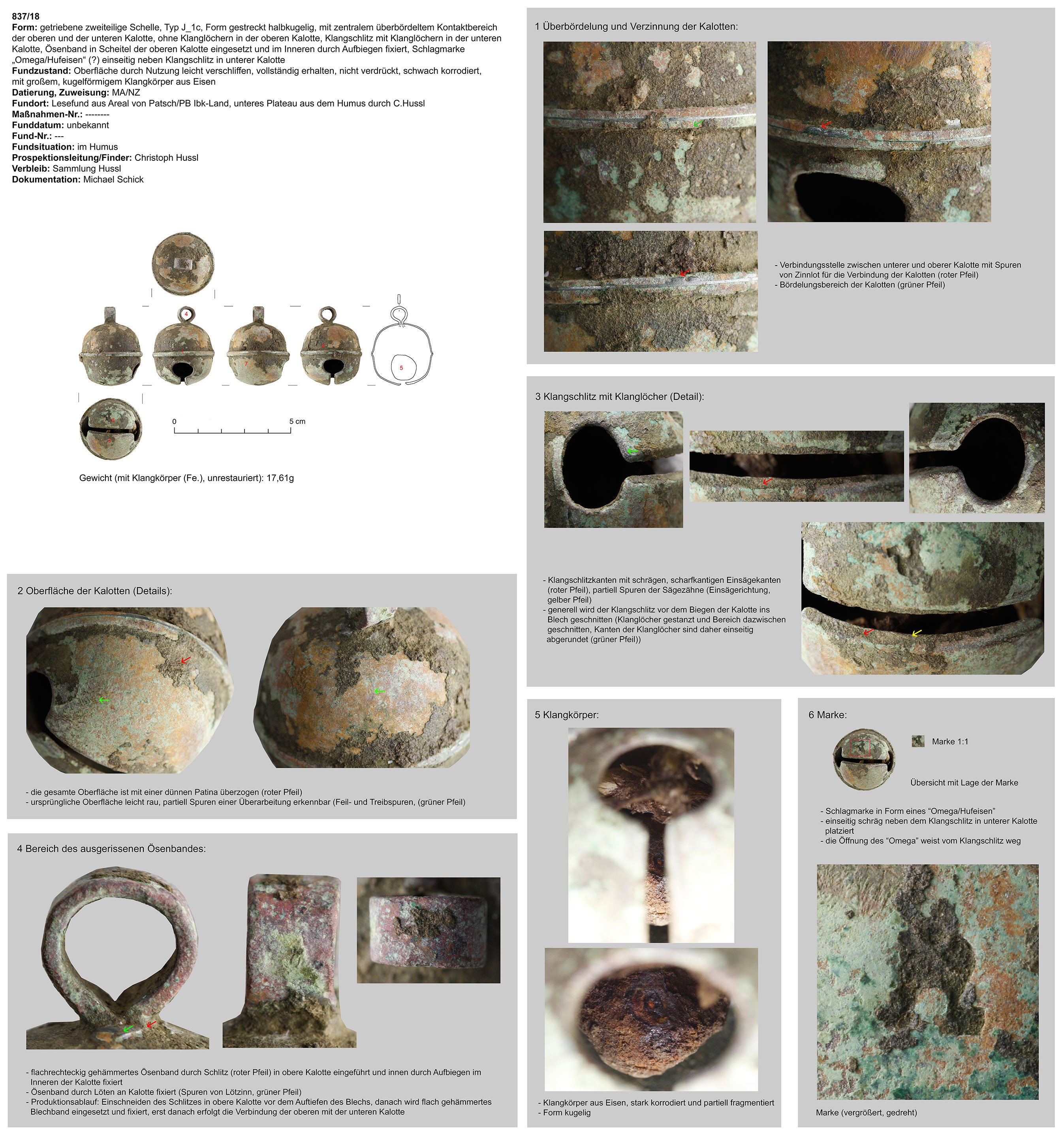 | 837/18 | kugelförmig, Eisen | Umfeld Patsch (Ch. Hussl) | Mittellage/Humus (Lesefund) | Marke in Form eines Hufeisens oder Omega | |