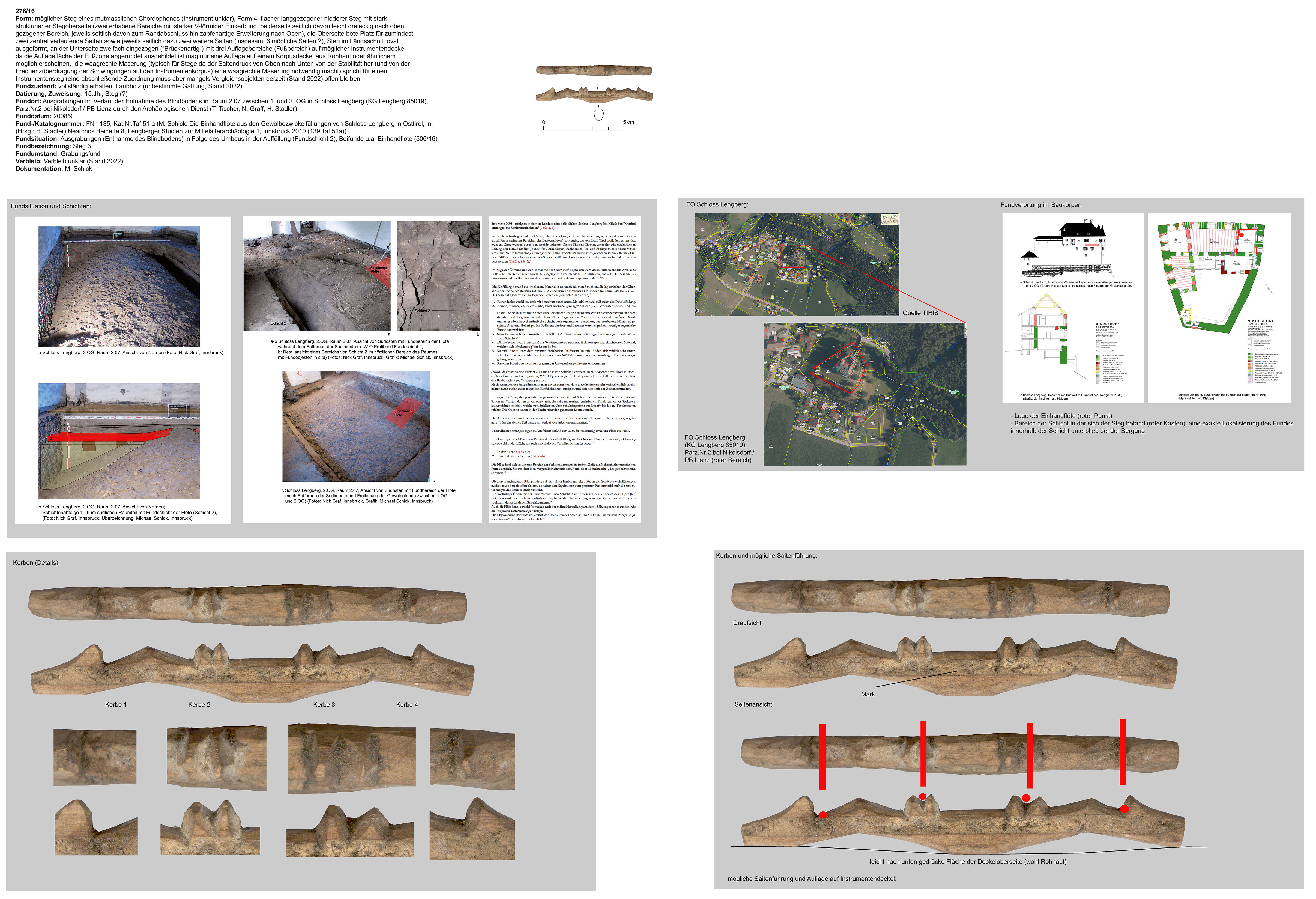 möglicher Steg eines Chordophones; flacher, lang-gezogener niederer Steg mit stark strukturierter Stegoberseite (zwei erhabene Bereiche mit starker V-förmiger Einkerbung, beidseits seitlich davon leicht dreieckig nach oben gezogener Bereich, jeweils seitlich zum Randabschluss hin zapfenartige Erweiterung nach oben); Oberseite böte Platz für zumindest 2 zentral verlaufende Saiten sowie jeweils seitlich dazu 2 weitere Saiten (insgesamt 6 mögliche Saiten?); Steg im Längsschnitt oval ausgeformt, an der Unterseite zweifach eingezogen (“brückenartig“) mit drei Auflagebereichen (Fußbereich) auf möglicher Instrumentendecke; da die Auflagefläche der Fußzone abgerundet ist, ist eine Auflage auf einem Korpusdeckel aus Rohhaut oder ähnlichem möglich; die waagrechte Maserung1 spricht für einen Instrumentensteg, Zuordnung muss aber mangels Vergleichsobjekten derzeit (Stand 2022) offen bleiben |