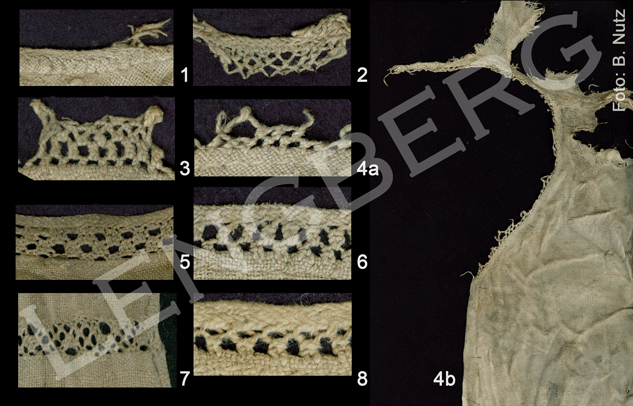 Some of the fragments of linen clothes are additionally decorated at the seams with finger-loop braided laces (Fig. 2, 1). These laces were either sewn directly onto the edge of the hem or connected to the linen fabric with simple needle-lace, sewn with linen ply-yarn, in between (Fig. 2). In the case of the shirt fragment (Fig. 1, right) which has parts of the left sleeve preserved, the needle lace served as decoration on the neck décolletage. Unfortunately here the finger-loop-lace is missing (Fig. 2, 4a and 4b).