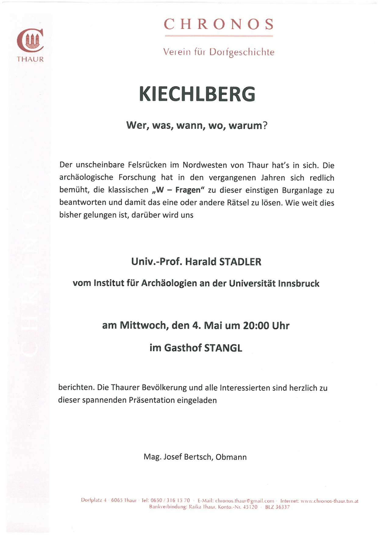 - Vortrag "Kiechlberg. Wer, was, wann, wo, warum?" im Gasthof Stangl, Thaur, 04.05.2011