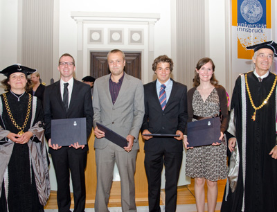 Mag. Philipp Strobl, MA, Mag. Martin Bodner, Bakk., Mag. Dr. Birgit Waltenberger und MMag. Martin Trenker erhielten beim Dies Academicus am 22. Juni jeweils 1.500 Euro, zur Verfügung gestellt vom Unternehmen MED-EL, für ihre hervorragenden Leistungen. Am 26. Juni verlieh Sabine Schindler, Vizerektorin für Forschung, mit jeweils 300 Euro dotierte Anerkennungspreise an sieben weitere Studierende, die hervorragende Arbeiten eingereicht hatten. Insgesamt hatten sich diesmal 28 Studierende um den Preis beworben.