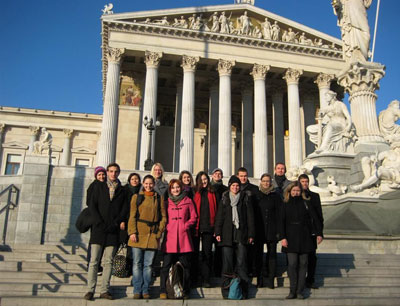 Eine Führung durch das Parlament am nächsten Tag bildete den Abschluss der Exkursion. Dr. Christoph Konrath und Dr. Carina Neugebauer gaben umfassende Informationen zum Gebäude, insbesondere zu den symbolträchtigen Bezügen zur griechischen Mythologie, welche nach der Vorstellung der Erbauer die Dauerhaftigkeit dieser demokratischen Kerninstitution untermauern sollten. Der Besuch wurde mit der Vorstellung der Abteilung RLW (Rechts-, Legislativ- und Wissenschaftlicher Dienst) durch die stellvertretende Leiterin Dr. Ingrid Moser und eine abschließende Frage- und Diskussionsrunde abgerundet.