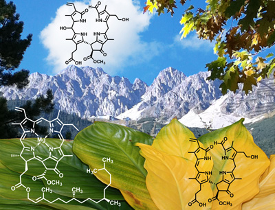 Chlorophyll dient den Pflanzen dazu, Licht in biologisch verwertbare Energie umzuwandeln. Die Moleküle sind so angeordnet, dass sie das Licht sammeln und die Energie weiterleiten können. Im Herbst holen sich die Pflanzen wichtige Nährstoffe, wie Stickstoff und Mineralien, aus ihren Blättern zurück. Dabei wird Chlorophyll aus den Proteinen, in die es normalerweise eingebunden ist, freigesetzt. In dieser freien Form ist es aber phototoxisch: unter Licht kann es dem Blatt schaden. Es muss daher durch Abbau „entgiftet“ werden. Welche Produkte dabei entstehen und wie diese biologischen Prozesse ablaufen, ist bis heute nicht restlos geklärt. Eine der weltweit führenden Forschungsgruppen auf diesem Gebiet ist das Team um Prof. Bernhard Kräutler und Dr. Thomas Müller vom Institut für Organische Chemie und dem CMBI der Universität Innsbruck. Wichtige Abbauprodukte des Chlorophylls konnten die Innsbrucker Chemiker in den vergangenen Jahren bereits klassifizieren. Nun haben sie das farblose Verbindungstück in diesem Abbauprozess dingfest gemacht, welches aus den zunächst unsichtbaren Abbauprodukten ein leuchtend gelbes und bereits bekanntes Pflanzenpigment entstehen lässt.