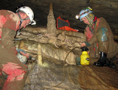 Das Hölloch im Allgäu ist die zweitgrößte Höhle Deutschlands, nur sehr schwer befahrbar und somit ausschließlich für Geübte zugänglich. Die Geologen Dr. Gina Moseley, Mag. Susanne Brandstätter und Prof. Christoph Spötl wählten diese Höhle als Schauplatz für ihre Untersuchungen, um Informationen darüber zu erlangen, wie sich das Klima in Mitteleuropa vor 30.000 bis 60.000 Jahren gestaltete. Unterstützt wurden sie von Kollegen der Universitäten in Minneapolis und Kopenhagen. „Da wir in unseren Breitengraden weder Eis- noch Tiefseeuntersuchungen durchführen können, ist das konservierende Potenzial der Höhlen ein ganz entscheidender Schlüssel zur Vergangenheit“, erklärt Spötl, der das vom FWF geförderte Forschungsprojekt leitete. Um Rückschlüsse auf die klimatischen Bedingungen ziehen zu können, entnahmen die Forscher Proben aus nach oben wachsenden Tropfsteinen, den Stalagmiten. Informationen über die tatsächlichen klimatischen Bedingungen lassen sich durch einen „Blick in den Sauerstoff“ herausarbeiten, erklärt Gina Moseley: „Wir haben insgesamt vier Stalagmiten aus der Höhle mit vier Proben pro Millimeter auf ihre Sauerstoff-Isotope untersucht“. Aus dem Verhältnis zwischen den leichteren und schwereren Isotopen von Sauerstoff lassen sich Rückschlüsse auf die klimatischen Bedingungen, wie z.B. Temperaturschwankungen, ziehen. „Wir können in den Stalagmiten lesen wie in einem Buch, vergleichbar mit Jahresringen bei Bäumen, allerdings Tausende Jahre weiter zurück als es mit Baumringen möglich ist“, sagt Moseley. Diese Ergebnisse ergänzten die Geologen mit Daten zur Chronologie, d.h. durch möglichst präzise Angaben zum Alter der Proben und verglichen sie mit Daten aus anderen Teilen der Erde. Drei Jahre arbeitete das Team um Gina Moseley an dieser vor Kurzem im Fachmagazin „Geology“ veröffentlichten Studie, die letztlich knapp 60 genaue Altersbestimmungen und etwa 4900 Sauerstoffisotopenmessungen der beprobten Stalagmiten enthält.