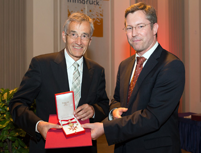 Für seine großen Leistungen als Wissenschaftler und Hochschulmanager erhielt Tilmann Märk gestern das Große Goldene Ehrenzeichen für Verdienste um die Republik Österreich. Es wurde ihm vom Leiter der Hochschulsektion im Bundesministerium für Wissenschaft, Forschung und Wirtschaft, Elmar Pichl, überreicht. Die Festansprache hielt der Präsident der Alexander-von-Humboldt-Stiftung und langjährige wissenschaftliche Weggefährte von Tilmann Märk, der deutsche Chemiker Helmut Schwarz von der Technischen Universität Berlin. „Grundlagenforschung ist zunächst einmal eine Kulturleistung. Sie ist kein Luxus, sie ist für das Leben und Überleben essentiell. Exzellenz in der Forschung gedeiht am besten da und dort, wenn Wissenschaftlerinnen und Wissenschaftlern ein Freiraum geschenkt wird, damit sie ihrem Streben nach Erkennen folgen können. Ein langer Atem in der Forschungsförderung ist unerlässlich. Und das Prinzip, Vertrauen zu schenken, statt einer auf Misstrauen gegründeten Überwachungsbürokratie zu vertrauen, das hat sich bewährt. Und schließlich, unser Grundsatz der Förderung von Personen statt der von Projekten den Vorzug zu geben, dieser Grundsatz hat den Test der Zeit bestanden“, fasste Schwarz seine Vision einer erfolgreichen Forschungsförderung zusammen. Geburtstagswünsche überbrachten auch der Universitätsratsvorsitzende Christian Smekal, der Senatsvorsitzende Ivo Hajnal, Dekan Bernhard Fügenschuh sowie Bruder Elmar Märk, der die Gäste auf eine fotografische Reise durch die Jugendjahre des Jubilars mitnahm. Für die musikalische Umrahmung sorgte das Vorarlberger Barockorchester Concerto Stella Matutina.