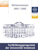 In den nächsten Tagen wird das interne Fortbildungsprogramm für das Wintersemester 2001/2002 an alle Mitarbeiterinnen und Mitarbeiter der Universität Innsbruck versandt. Für besonders Neugierige gibt es bereits jetzt die Möglichkeit, sich auf der Homepage des Vizerektorats für Personal, Personal- und Organisationsentwicklung über die aktuellen Fortbildungsveranstaltungen zu informieren.